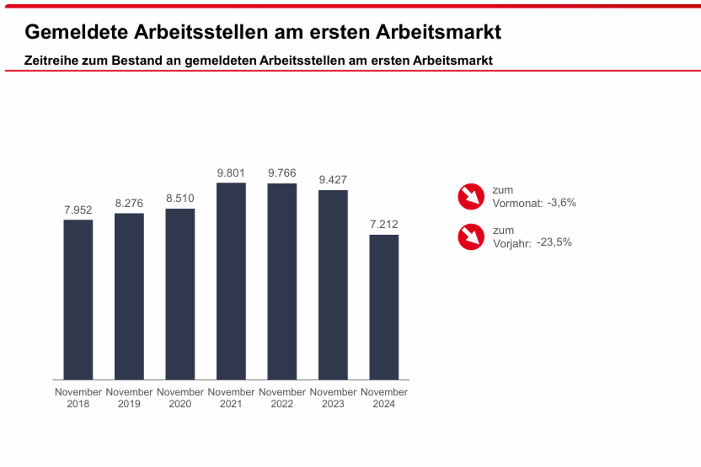 Die Unternehmen suchen weiterhin Mitarbeitende, so die Arbeitsagentur: 1.049 Stellen wurden im November neu gemeldet (96 weniger als im Vormonat und 375 weniger als vor einem Jahr).