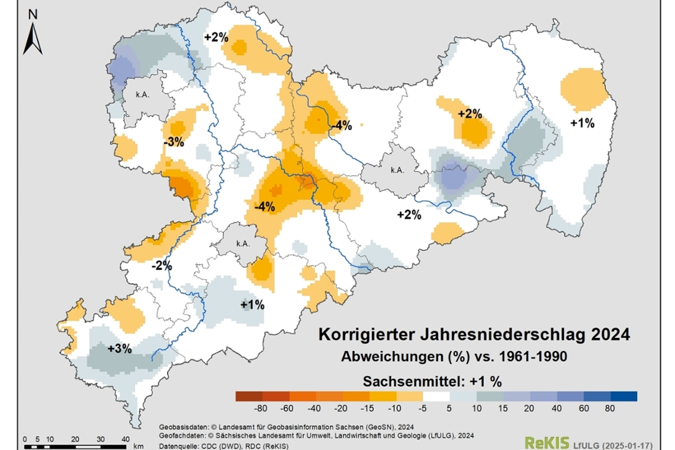 Trotz des ausgeglichenen Niederschlags 2024 weist die klimatische Wasserbilanz (Niederschlag minus Verdunstung) in Sachsen gegenüber der Klimareferenzperiode 1961–1990 ein Bilanzdefizit von 105 Litern pro Quadratmeter aus. Dieses Defizit resultiert ausschließlich aus der auf mittlerweile +23 Prozent gestiegenen potenziellen Verdunstung. Zum Vergleich: Im Jahr 2023 lag der Verdunstungsüberschuss bei 11 Prozent. Dieser Effekt wird maßgeblich durch das weiterhin steigende Temperaturniveau sowie durch die Zunahme der Sonnenstunden (Globalstrahlung) verursacht.