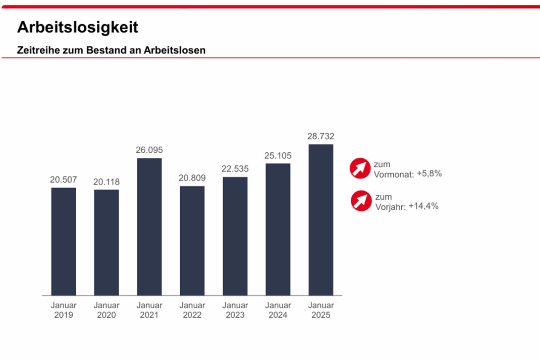 Die Arbeitslosigkeit ist im Bezirk der Agentur für Arbeit Leipzig im Januar 2025 gestiegen. 28.732 Menschen waren arbeitslos gemeldet, 1.563 Personen mehr (6 Prozent) als im Dezember und 3.627 Personen bzw. 14 Prozent mehr als vor einem Jahr. Die Arbeitslosenquote betrug 8,4 Prozent und lag mit 1 Prozent über dem Vormonatsniveau. Vor einem Jahr lag sie bei 7,5 Prozent.