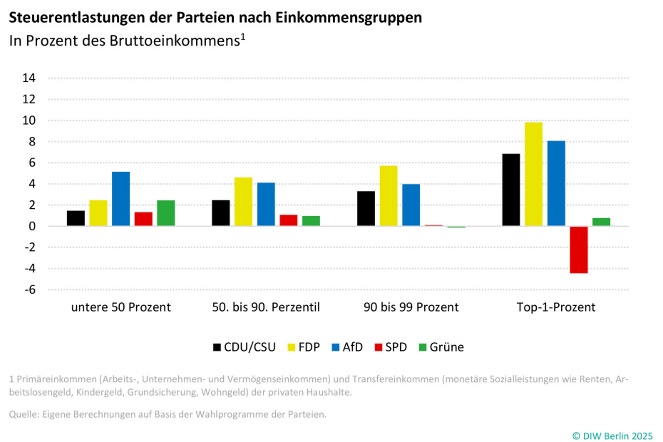 „Durch die Entlastungen bei der Einkommensteuer, den vermögensbezogenen Steuern und vor allem den Unternehmenssteuern kommen die Entlastungen vor allem bei den Besser- und Hochverdienenden an. So gehen bei der Union gut die Hälfte und bei der FDP knapp die Hälfte der Steuerentlastungen an die einkommensreichsten zehn Prozent der Bevölkerung, etwa ein Viertel an das reichste Prozent“, stellt das DIW fest.