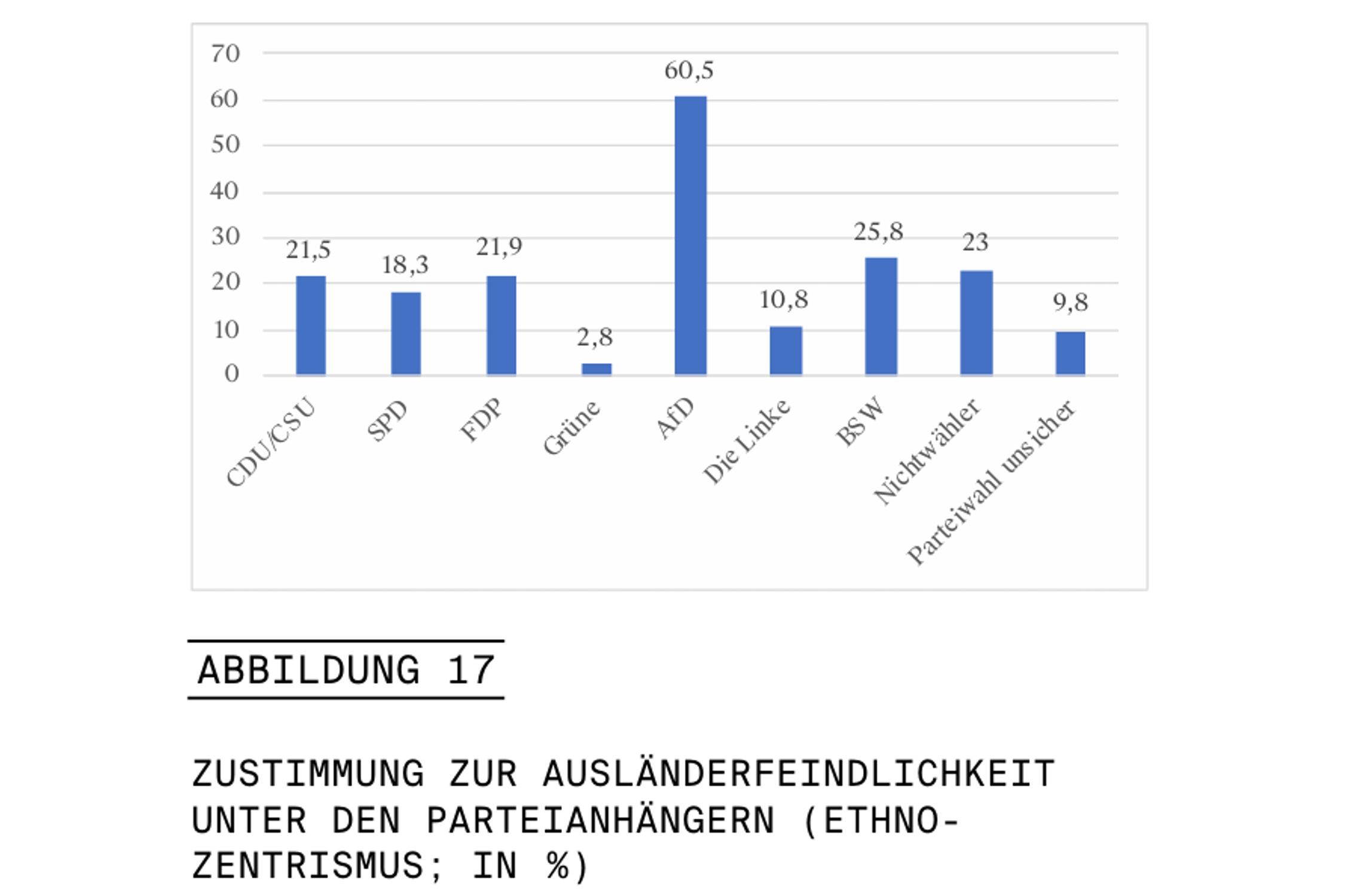 Ein wichtiger Befund dieser Sekundärauswertung ist die Wählerwanderung von Menschen mit rechtsextremer Einstellung und autoritären Aggressionen weg von der CDU/CSU und SPD hin zur AfD. Unter den Anhängern der Parteien fallen immer wieder die der AfD durch hohe Aggressionsbereitschaft und Ressentiments gegen viele Bevölkerungsgruppen auf. In diesem politischen Milieu herrscht eine destruktive Atmosphäre, in der die Ausgrenzung von Menschen auf der Grundlage einer behaupteten Gruppenzugehörigkeit legitimiert wird.