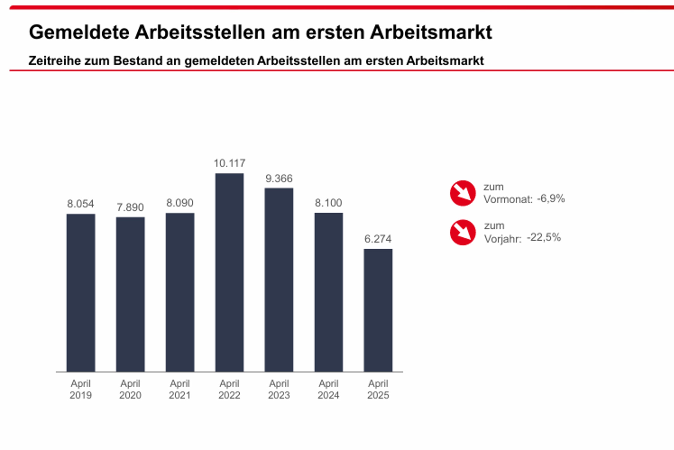 Tatsache ist, dass etliche Unternehmen weiterhin Mitarbeitende suchen: 1.086 Stellen wurden im April neu gemeldet (27 weniger als im Vormonat und 96 weniger als vor einem Jahr). Die meisten freien Stellen gibt es aktuell in den Branchen sonstige wirtschaftliche Dienstleistungen, freiberufliche, wissenschaftliche und technische Dienstleistungen, Baugewerbe, Gesundheits- und Sozialwesen, Verarbeitendes Gewerbe, Verkehr und Lagerei. Aktuell befanden sich damit 6.274 freie Stellen im Bestand der Arbeitsagentur.