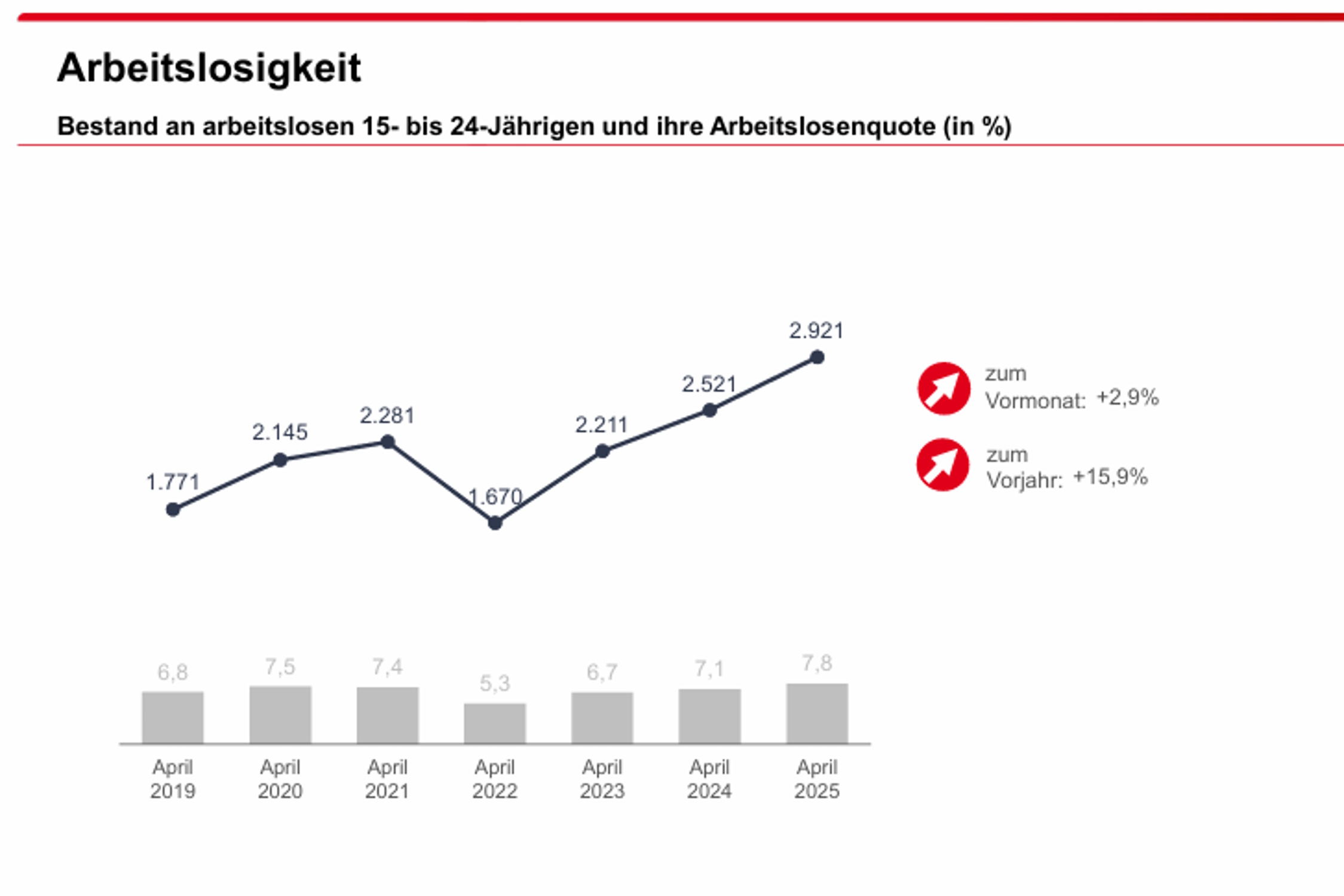 Bei der Zahl der als frei gemeldeten Stellen gab es freilich in Leipzig in den letzten Jahren auch mal eine andere Dynamik. 2022 waren bspw. in der Spitze über 10.000 als frei gemeldet. Auch 2023 waren es noch über 9.000. Dieser Wert ist mittlerweile auf 6.274 abgesunken, Zeichen dafür, dass viele Unternehmen derzeit auf Stellenneubesetzungen verzichten. Und das trifft eben zuallererst die jungen Arbeitsuchenden. Derzeit sind im Leipziger Agenturbezirk 2.921 Jugendliche unter 25 Jahren ohne Beschäftigung. Im Vorjahresvergleich liegt die Zahl der arbeitslosen Jugendlichen um 400 bzw. 15,9 Prozent höher.