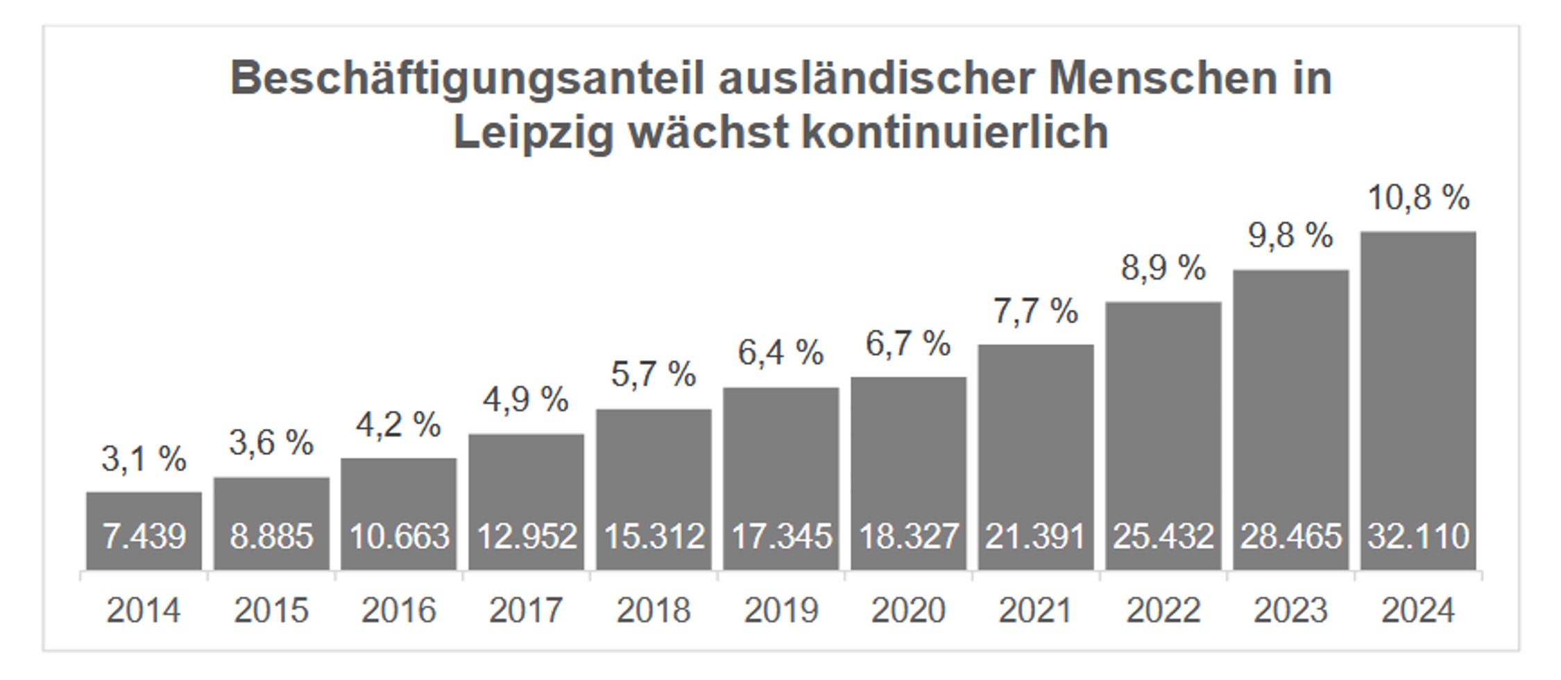 Während im Jahr 2014 noch rund 7.400 ausländische Beschäftigte in Leipzig gemeldet waren, ist ihre Zahl bis Mitte 2024 auf über 32.000 gestiegen – eine Vervierfachung innerhalb des letzten Jahrzehnts.