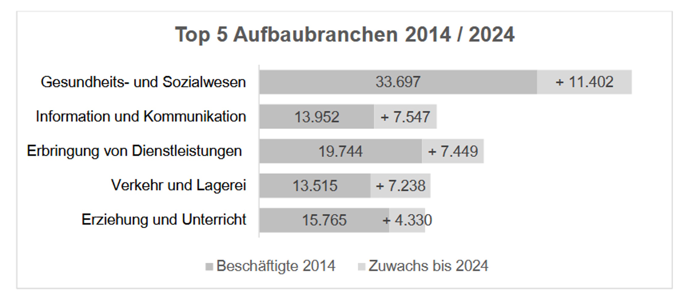 Die größten Beschäftigungszuwächse verzeichnen Branchen, die auf Wissen, Technik und menschliche Nähe setzen: Das Gesundheits- und Sozialwesen legte um über 11.000 Stellen zu, gefolgt von Information und Kommunikation (+7.500), freiberuflichen und technischen Dienstleistungen (+7.400) sowie dem Bereich Verkehr und Lagerei (+7.200). Auch das Gastgewerbe verzeichnet ein starkes Plus (+3.900) – nicht zuletzt dank touristischer Impulse und neuer Gastro-Konzepte.