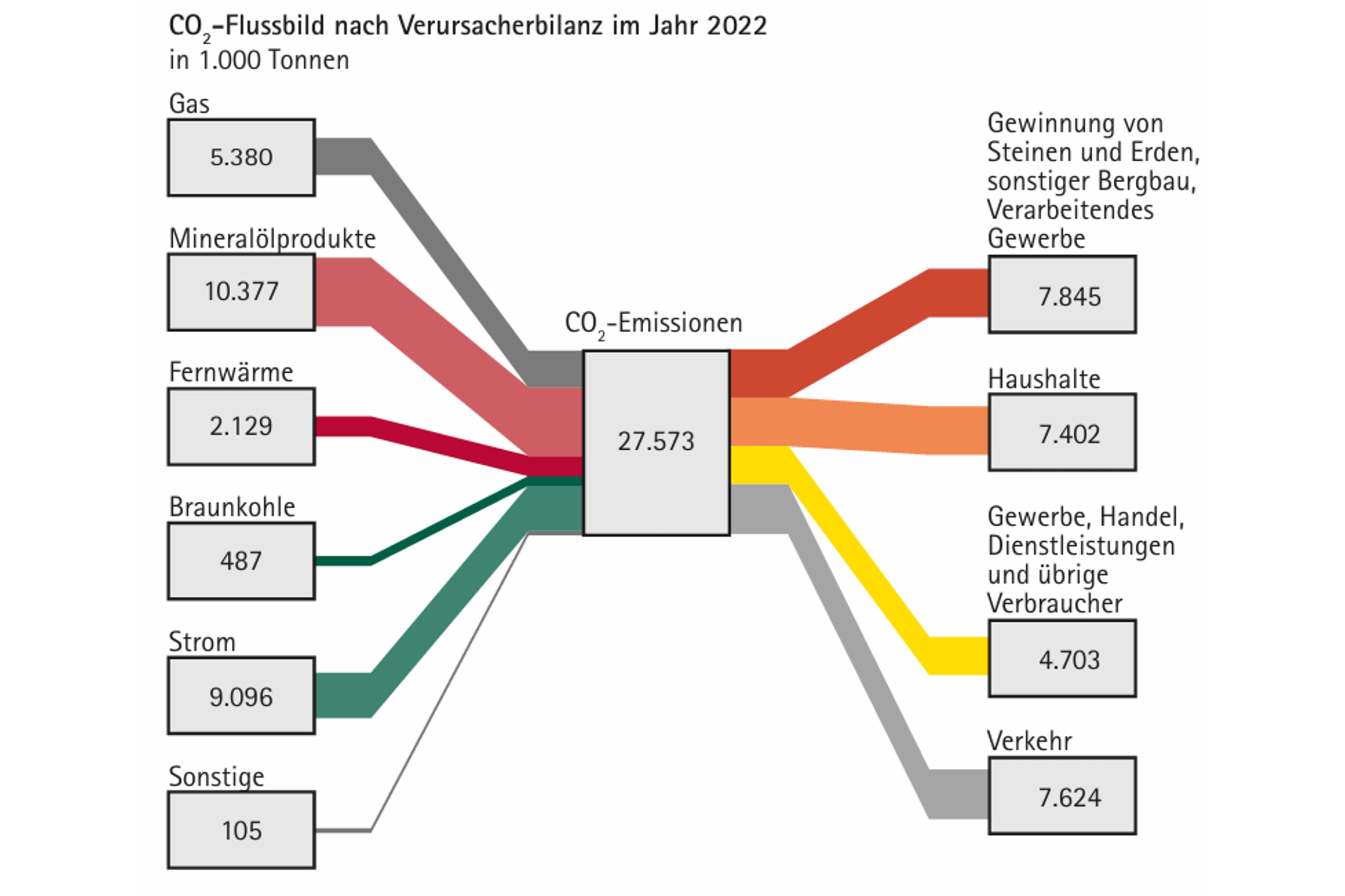 „Die Emissionen aus dem Verbrauch von Gasen nahmen hingegen gegenüber dem Vorjahr um etwas mehr als ein Zehntel auf 7,4 Millionen Tonnen ab. Auf den Verbrauch von Mineralölen bzw. Mineralölprodukten entfiel 2022 etwa ein Fünftel aller Emissionen (10,6 Millionen Tonnen), fast 3 Prozent mehr als 2021“, berichtet das Statistische Landesamt.