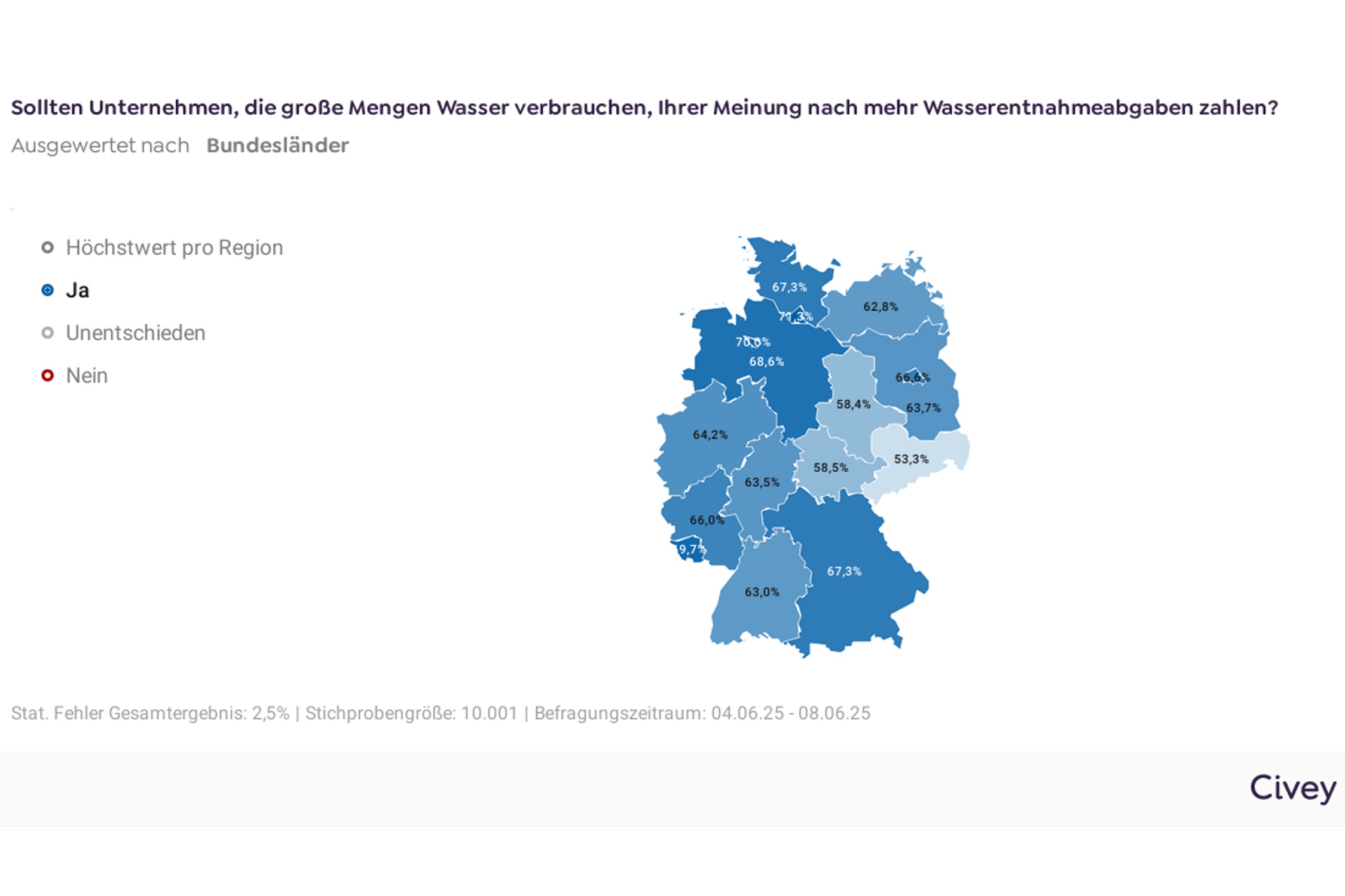 Die Zustimmung zu höheren Wasserentnahmegebühren für Unternehmen ist im Norden allgemein höher. Was sich dann wieder mit den am Montag veröffentlichen Daten zur Grundwasserübernutzung deckt.
