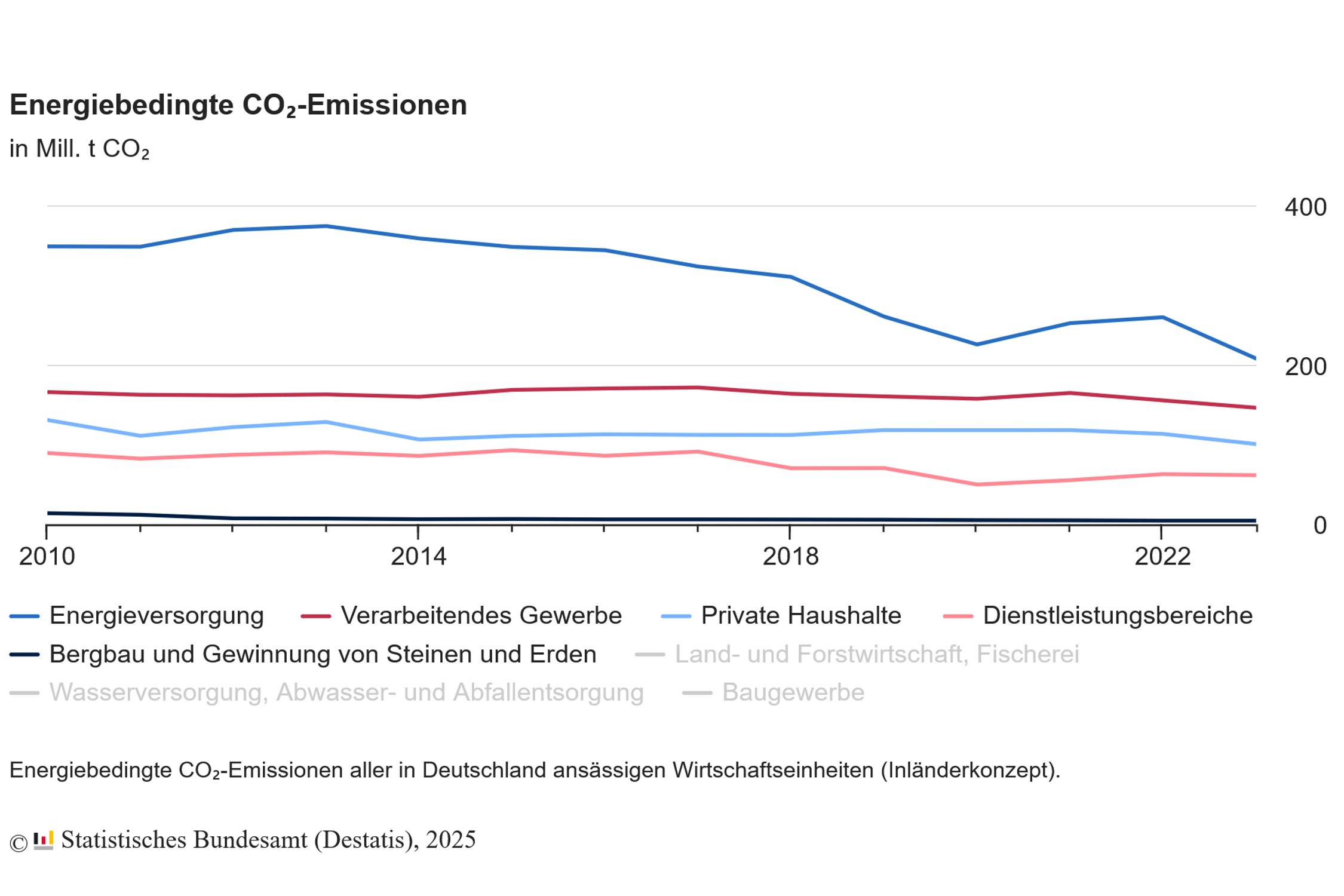Dieser Wirtschaftszweig reduzierte seine energiebedingten CO₂-Emissionen um 40,3 % (2023: 208,6 Millionen Tonnen gegenüber 2010: 349,6 Millionen Tonnen). Insbesondere hier hatte die Reduktion des Einsatzes von Kohle (-52,0 %) in Kraftwerken zur Erzeugung von Strom und Wärme für andere Wirtschaftszweige und private Haushalte einen großen Einfluss.“