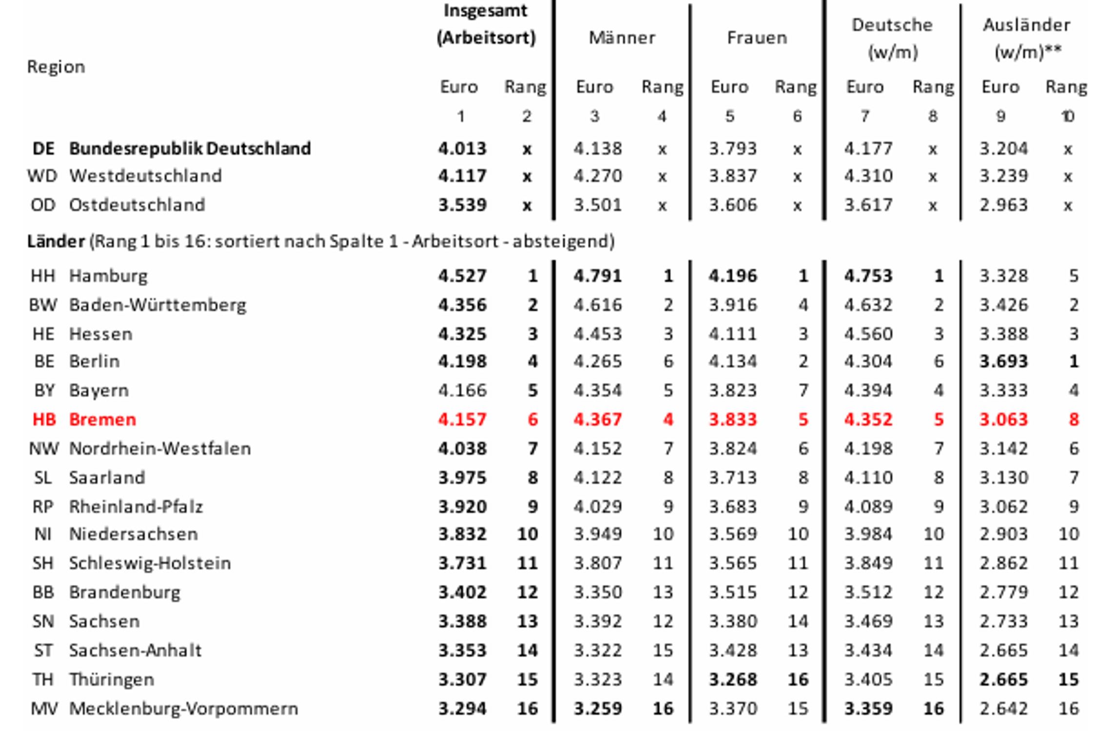 Aber selbst in den Städten NRWs, die teilweise selbst in ihren eigenen Krisen stecken, liegen die Medianbruttogehälter teilweise deutlich über 4.000 Euro. Frankfurt / Main kommt als Bankenmetropole schon auf 5.202 Euro, die Landeshauptstadt von Baden-Württemberg, Stuttgart, auf 5.323 Euro und die bayerische Landeshauptstadt München auf 5.362 Euro.
