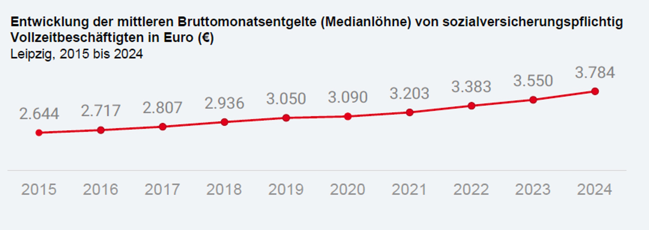 In der Stadt Leipzig lag das mittlere Einkommen für sozialversicherungspflichtige Vollzeitbeschäftigte 2024 bei 3.784 Euro. Gegenüber dem Jahr 2023 sind die Löhne und Gehälter in Leipzig damit um 234 Euro bzw. 6,6 Prozent gestiegen. Im Landesvergleich liegt der Medianlohn in Leipzig damit 396 Euro über dem sächsischen Median. Nur in Dresden wurde mehr verdient (3.932 Euro).