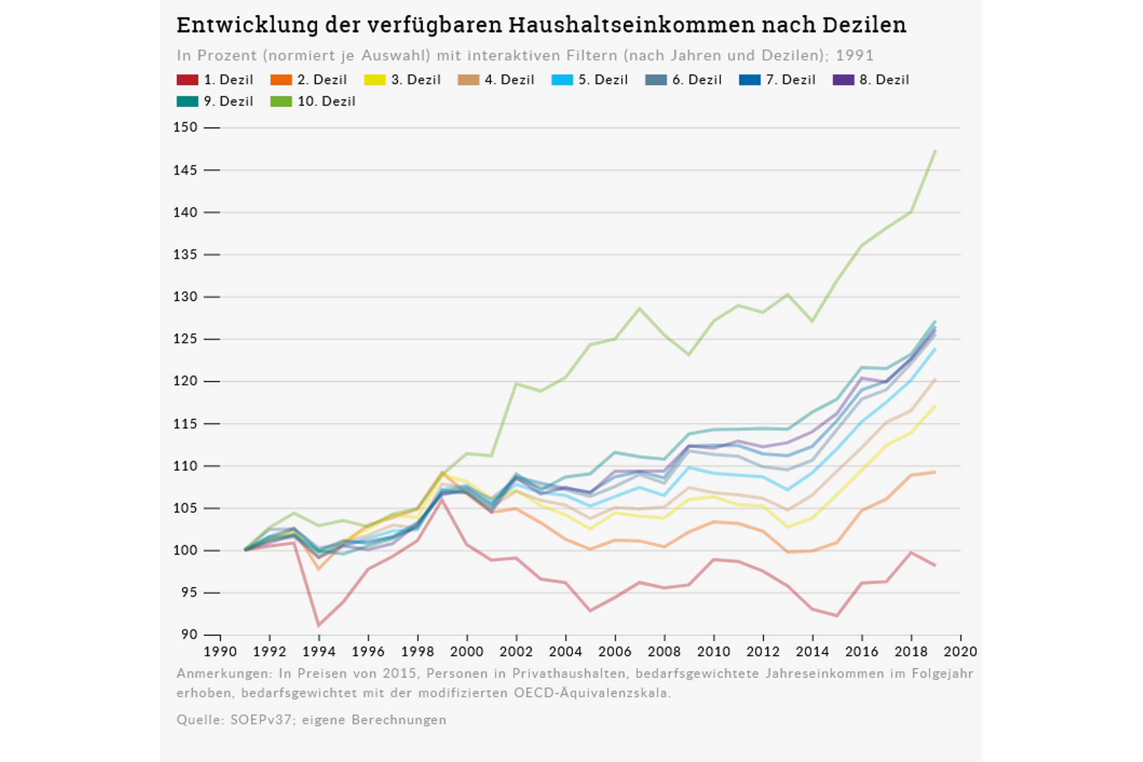 Höfgen blendet dabei auch eine Grafik des Deutschen Instituts für Wirtschaftsforschung (DIW) Berlin ein, die zeigt, wie die Haushaltseinkommen der unterschiedlichen Einkommensgruppen seit dem Jahr 1998 deutlich auseinandergegangen sind – Folge der Steuerentlastung, die damals die Schröder-Regierung beschloss, aber auch der seit 1997 ausgesetzten Vermögenssteuer.