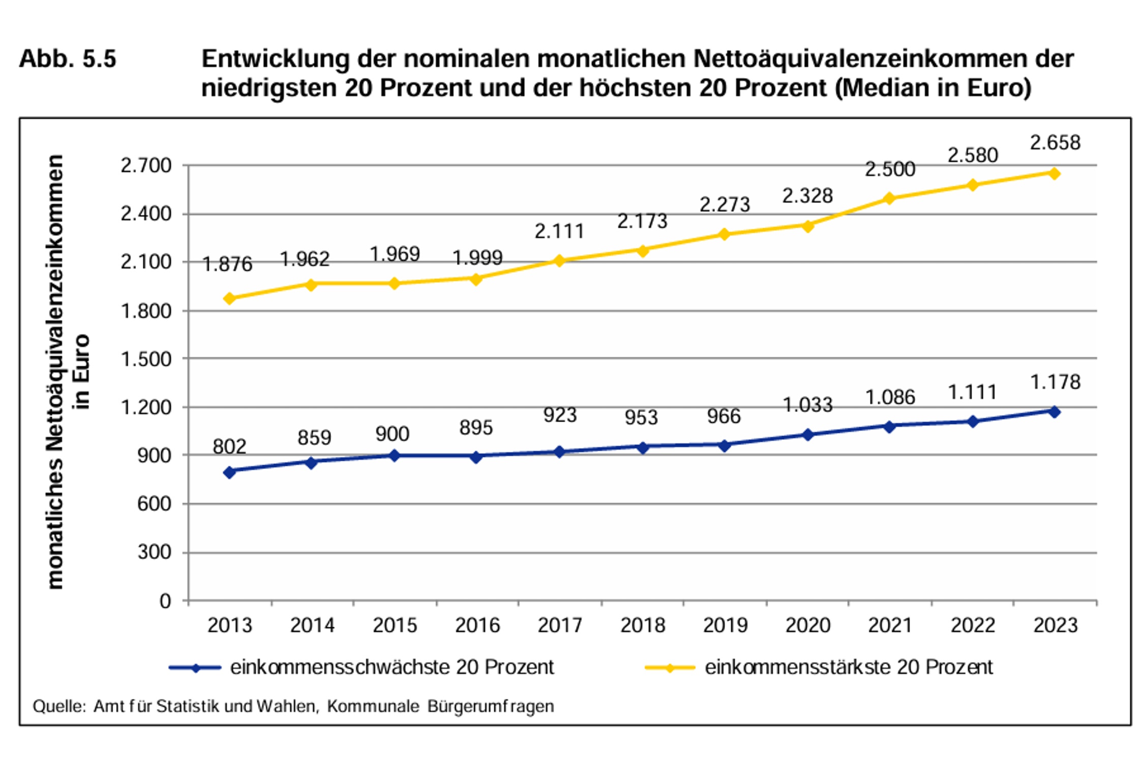 2022 waren die Nettoäquivalenzeinkommen der einkommensstärksten 20 % 2,3 Mal so hoch wie die der einkommensschwächsten 20 %. Im bundesweiten Vergleich sind die Einkommensunterschiede in Leipzig dabei vergleichsweise gering. So verfügen die einkommensstärksten 20 % im gesamtdeutschen Durchschnitt über mehr als viermal so viel Einkommen wie die einkommensschwächsten 20 % der Bevölkerung.“
