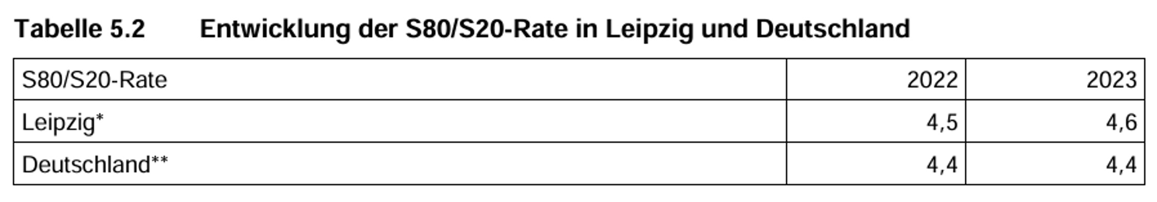 „Die Einkommensunterschiede haben sich dabei zwar in den letzten Jahren absolut vergrößert, sind relativ aber stabil geblieben. Seit 2022 wird der relative Einkommensabstand als S80/S20-Rate ermittelt. Die S80/S20-Rate gibt an, wie viel Einkommen das einkommensstärkste Fünftel im Verhältnis zum einkommensschwächsten Fünftel erzielt. 2023 lag die Rate in Leipzig bei 4,4 und entsprach damit dem bundesdeutschen Wert“, kann man da lesen.