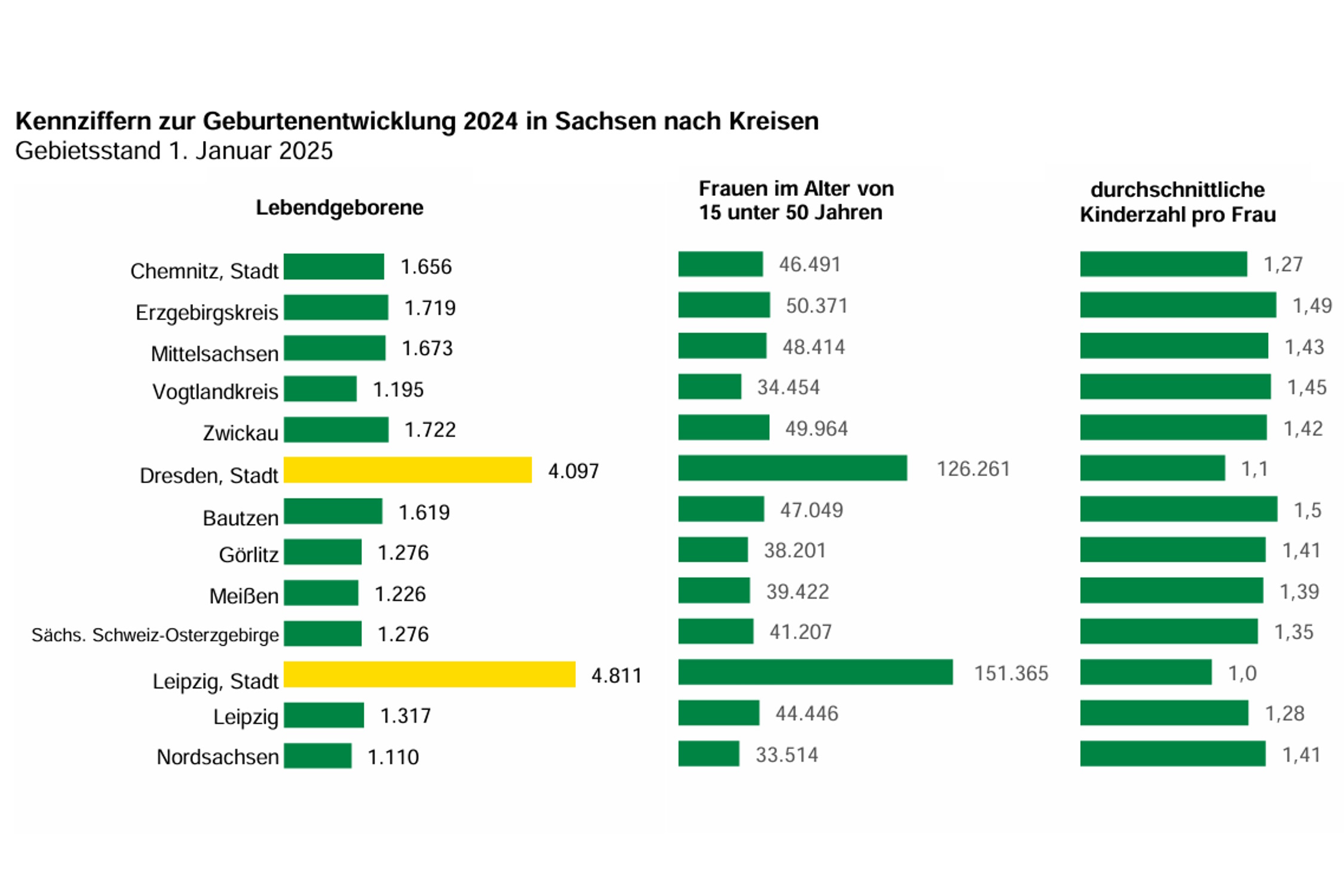 „Der Vergleich zur gesamtsächsischen durchschnittlichen Kinderzahl pro Frau von 1,22 im Jahr 2024 belegt ebenfalls den großen Einfluss der Kreisfreien Städte Dresden und Leipzig“, so das Statistische Landesamt. „Nur diese beiden Städte liegen deutlich unter 1,22 Kindern pro Frau. Die Stadt Chemnitz (1,27 Kinder pro Frau) sowie alle Landkreise weisen 2024 eine höhere durchschnittliche Kinderzahl pro Frau auf. Die durchschnittliche Kinderzahl pro Frau lag 2024 in den Landkreisen zwischen 1,28 (Landkreis Leipzig) und 1,5 (Landkreis Bautzen).“