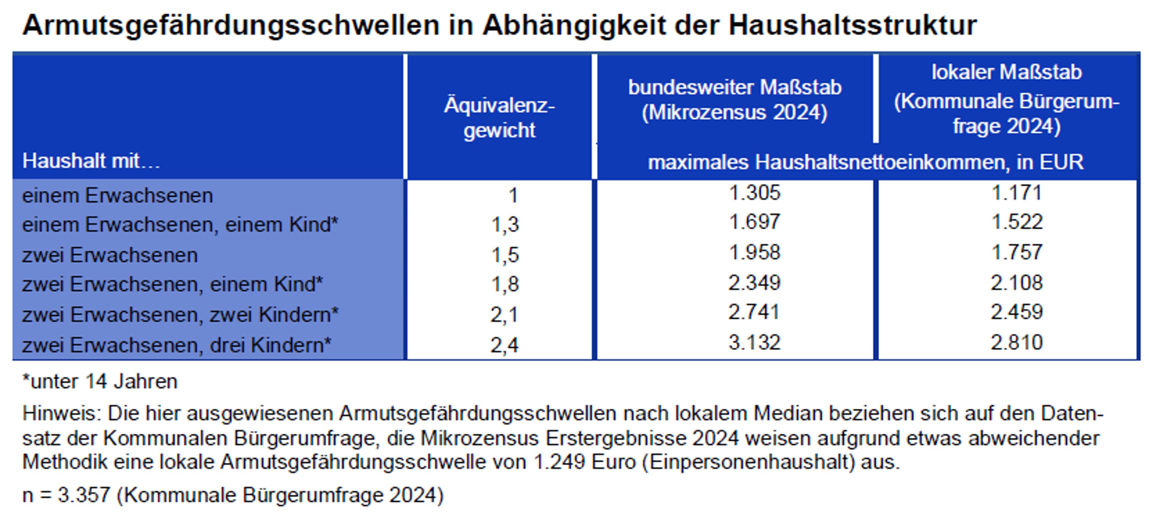 „Es ergibt sich ein Schwellenwert von 1.171 Euro (Kommunale Bürgerumfrage 2024). Betrachtet man hingegen den bundesweiten Median gemäß Mikrozensus 2024 (Erstergebnisse), liegt die Grenze bei 1.305 Euro. Beide Ansätze sind nachvollziehbar: Die Orientierung am lokalen Einkommensniveau ist insofern sinnvoll, als auch die Lebenshaltungskosten – insbesondere Mieten – stark von regionalen Gegebenheiten abhängen.