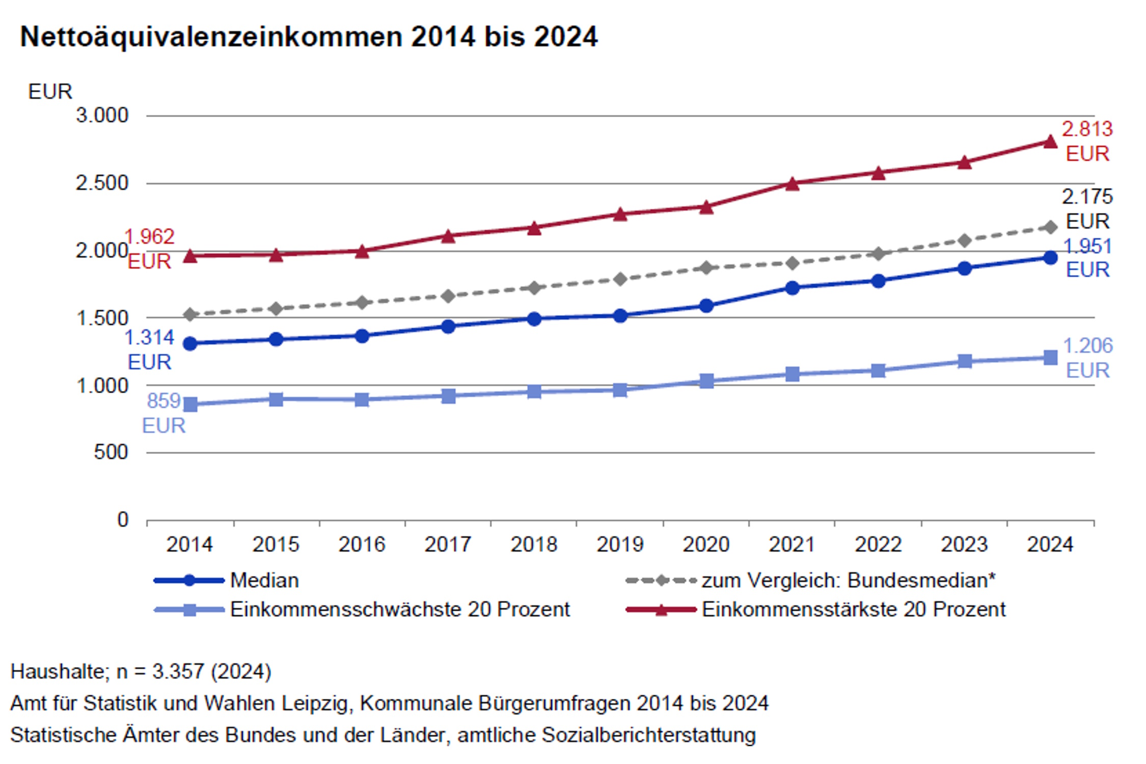 Entwicklung der Nettoäquivalenzeinkommen in Leipzig. Grafik: Stadt Leipzig, Bürgerumfrage 2024