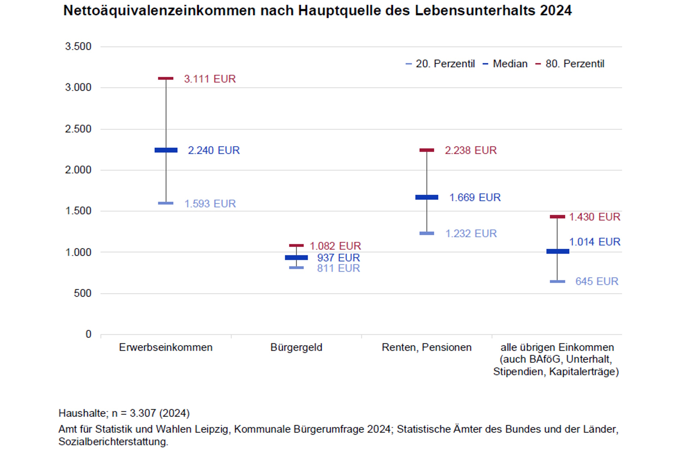 Zur  Spreizung der Nettoäquivalenzeinkommen in Leipzig. Grafik: Stadt  Leipzig, Bürgerumfrage 2024