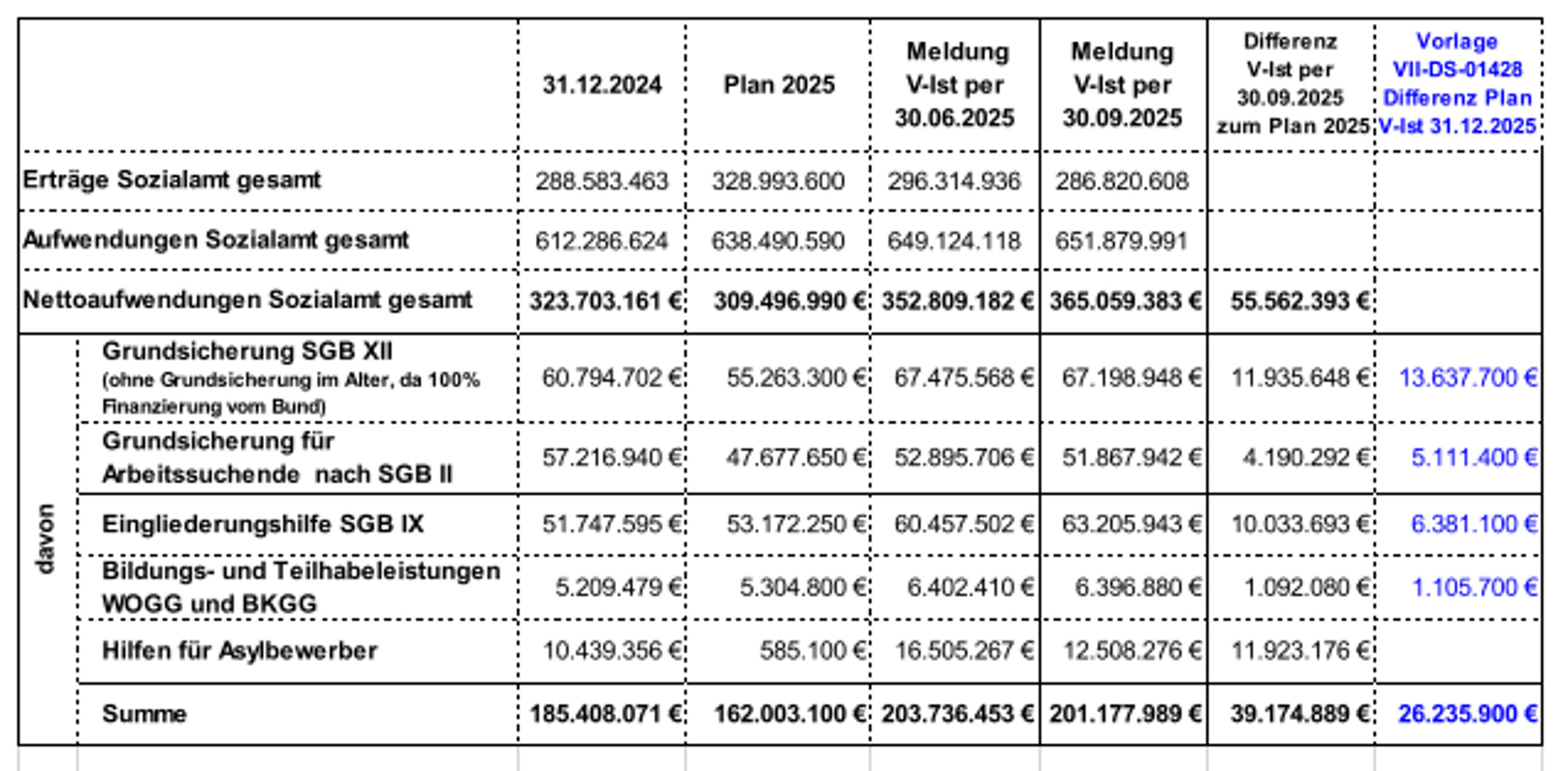 Grundlage dafür war die Auskunft des Sozialdezernats zu den Nettoaufwendungen bis zum Juni 2025. Bis dahin waren schon 352 Millionen Euro aufgelaufen als Differenz zwischen Ausgaben und Einnahmen. Und das war schon wieder eine Ecke mehr als im gesamten Jahr 2024, als das Minus zum Jahresende 324 Millionen Euro betrug. Geplant hatte das Sozialdezernat 2025 mit 309 Millionen Euro.