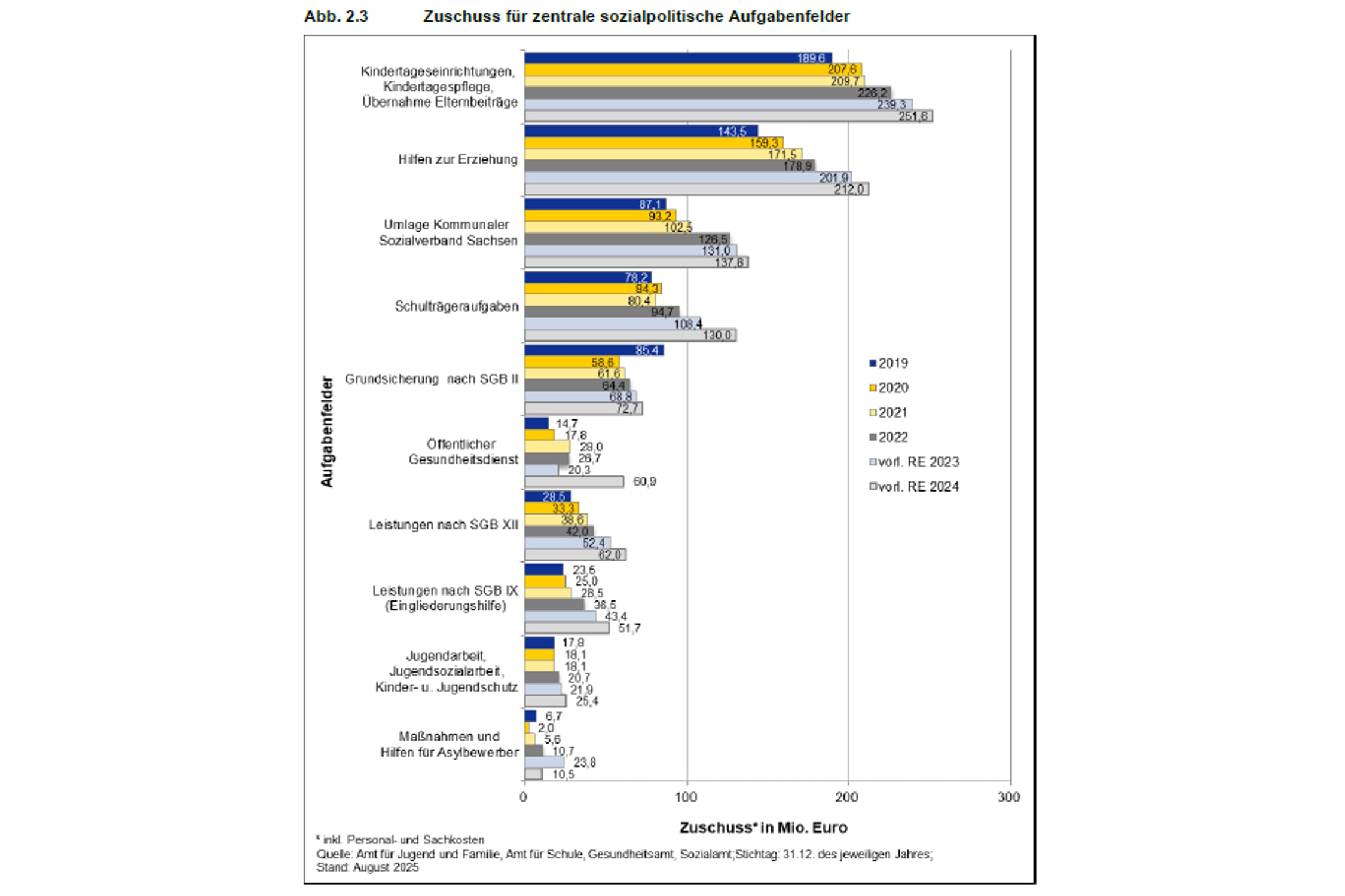 Seit dem Jahr 2019 stiegen die Aufwendungen der Stadt Leipzig für sozialpolitische Aufgaben kontinuierlich um 53 % (575,2 Mio. Euro), im Vergleich zum Vorjahr betrug der Anstieg 170,3 Mio. Euro. Darin enthalten sind Aufwendungen für den Ausgleich des bilanzierten Jahresfehlbetrages 2023 der Klinikum St. Georg gGmbH in Höhe von 36,3 Mio. Euro.“