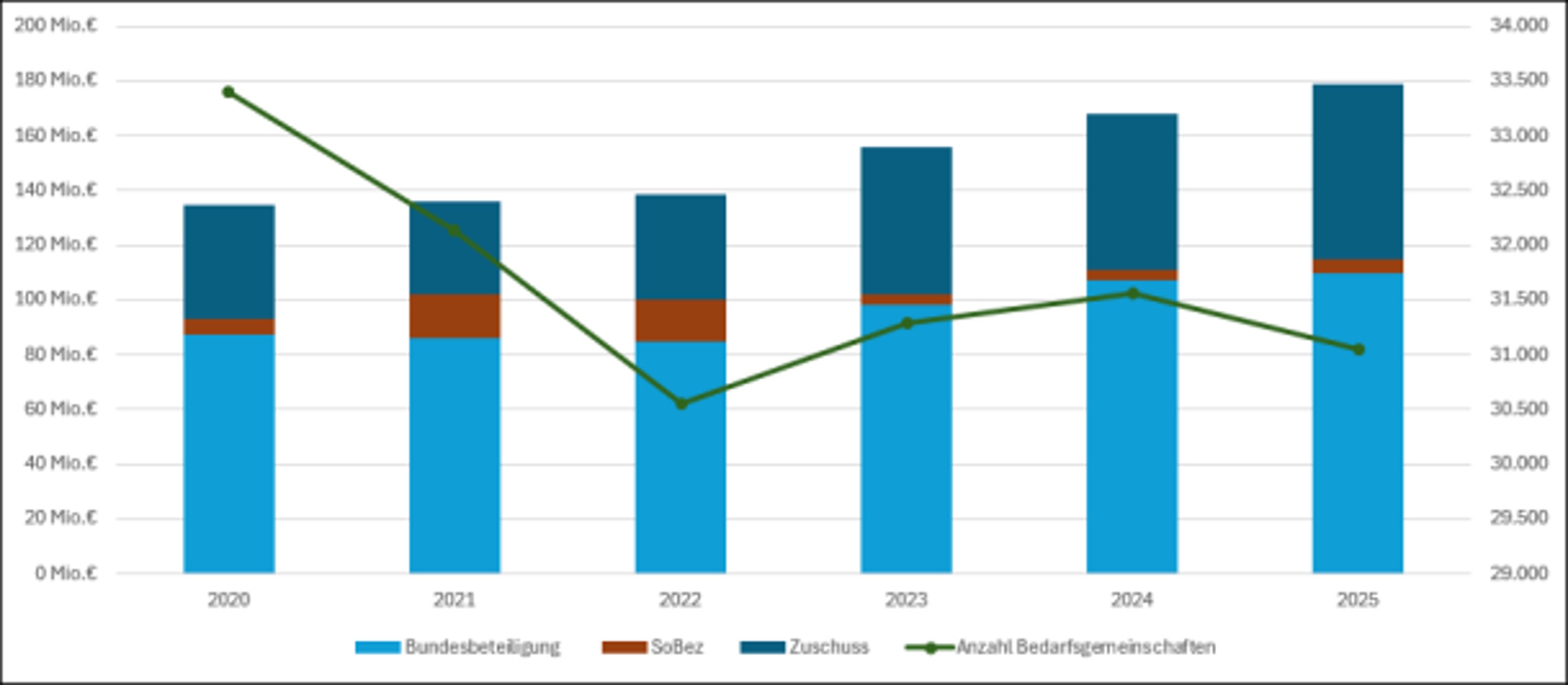 Im Jahr 2025 sank die Anzahl der Bedarfsgemeinschaften im SGB II in der Stadt Leipzig ggü. dem Vorjahr auf vorläufig 31.058. Dem entgegen stiegen die Kosten der Unterkunft jedoch ggü. dem Vorjahr um 10,8 Mio. €. Dies ist auf die steigenden Mietkosten zurückzuführen. Damit wird deutlich, dass die Anzahl der Bedarfsgemeinschaften nur teilweise Einfluss auf die Kosten der Stadt Leipzig hat.“