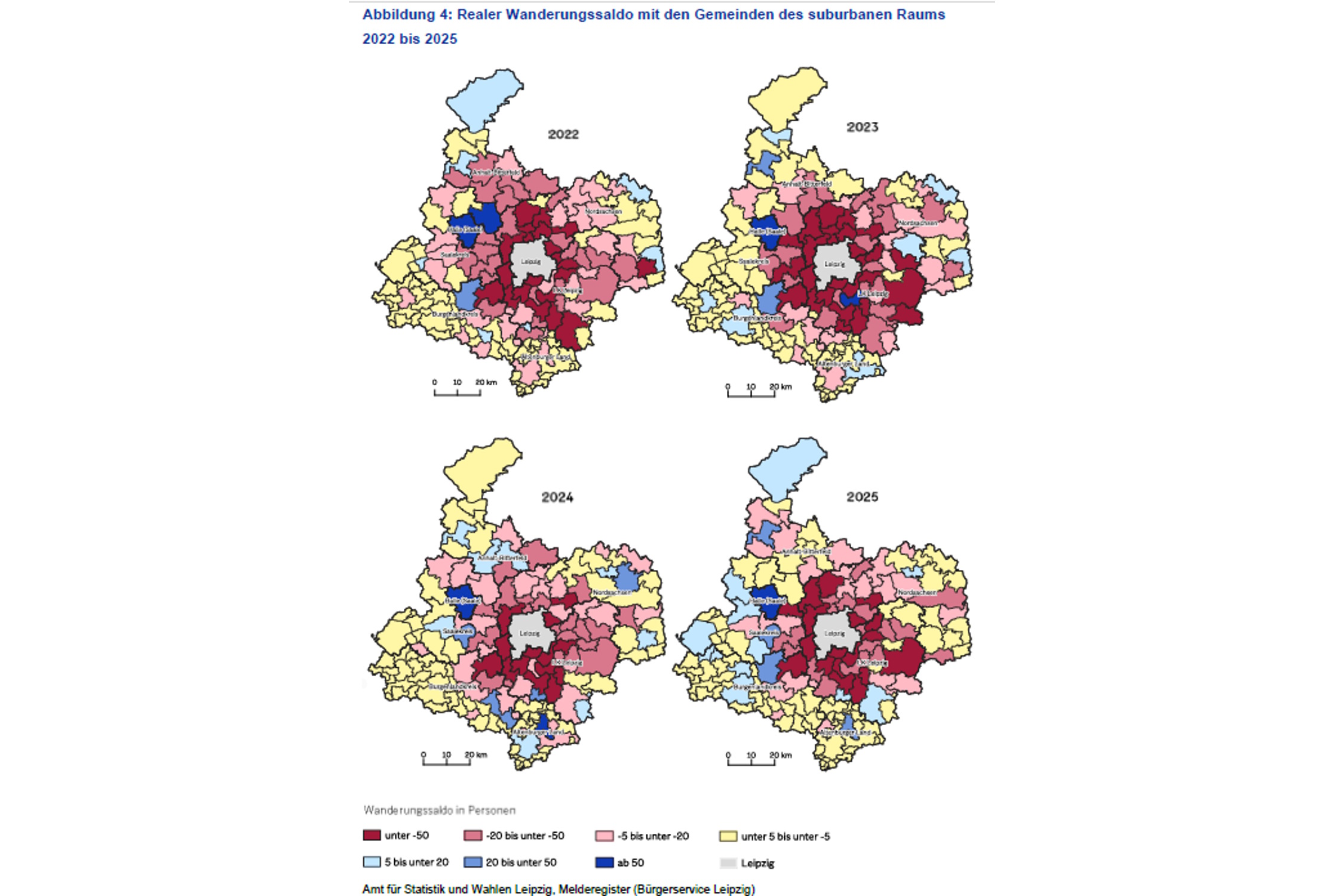 Aber Schultz und Lagrange zeigen sich in ihrem Beitrag zuversichtlich: „Seit dem Jahr 2022 geht die Suburbanisierung in Leipzig wieder zurück, die ‘Welle’ ebbt ab. Die Wanderungsverluste in die fünf Umlandkreise nehmen Jahr für Jahr wieder ab und stagnieren seit 2024. Gleichzeitig zieht sich der suburbane Raum in seiner Ausdehnung wieder zusammen: Die räumliche Reichweite hoher Wanderungsverluste aus der Kernstadt verringert sich erneut …“