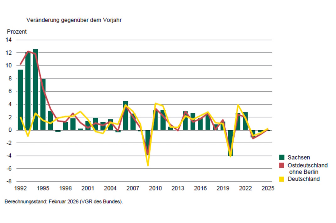 Das preisbereinigte Bruttoinlandsprodukt (BIP) verringerte sich in Sachsen 2025 um 0,2 Prozent im Vergleich zum Vorjahr (Deutschland: +0,2 Prozent). Damit verzeichnete die sächsische Wirtschaft im dritten Jahr in Folge einen realen Rückgang des BIP. Innerhalb von Deutschland reichte die reale Veränderung des BIP im Vergleich zu 2024 von einem Rückgang um 0,9 Prozent im Saarland bis zu einem Plus von jeweils 1,4 Prozent in Bremen und Mecklenburg-Vorpommern.