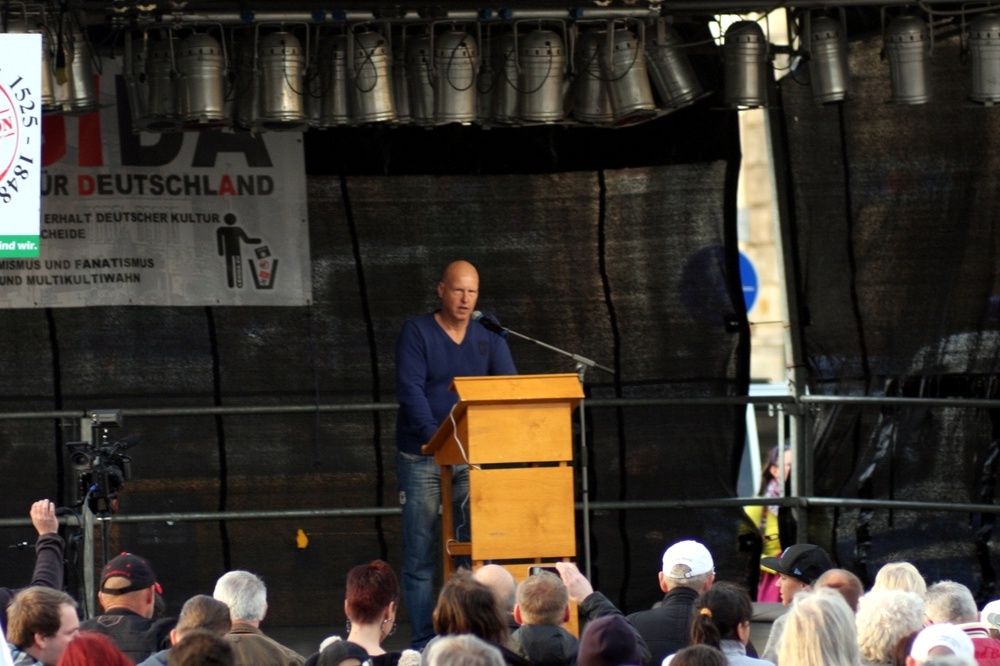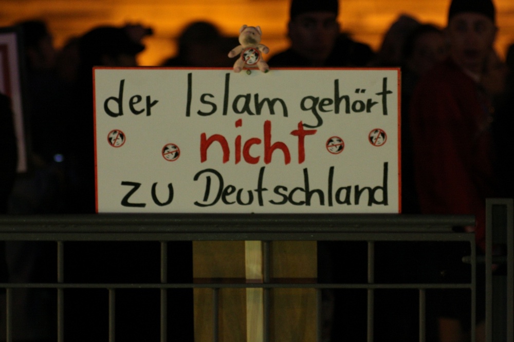 Der zweite Teil mit Gastredner Thomas Festerling findet ein etwas rascheres Ende. Auch zu dieser Ansprache verschieben wir eine kleine Analyse und schauen nochmals auf ein paar Eindrücke über die Forderungen im Publikum. Während sich Festerling auf der Bühne eher mühte, die Konsensfähigkeit der Bewegung mit anderen Initiativen (unter anderem gegen TTIP) zu betonen, ist mancher bei Legida damit beschäftigt, den Namen der Bewegung auch in Parolen darzustellen. Entgegen der Tatsache, dass derzeit etwa 4,5 Millionen Muslime in Deutschland leben …