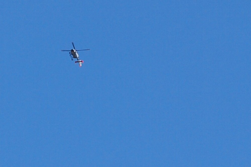 Der Polizeihubschrauber ist bereits in der Luft und steht über dem westlichen Ring am Himmel.