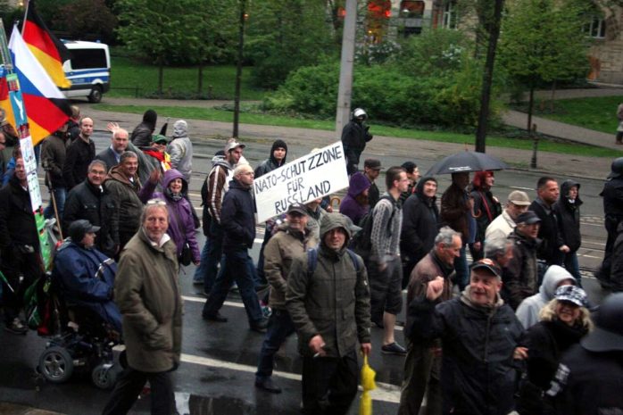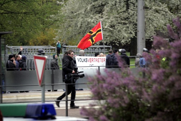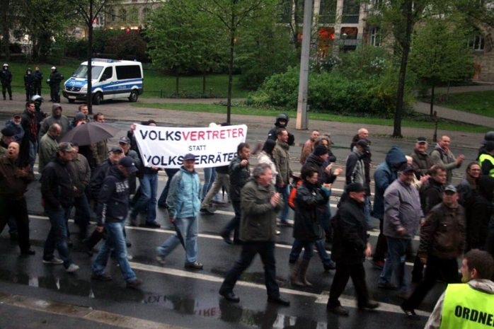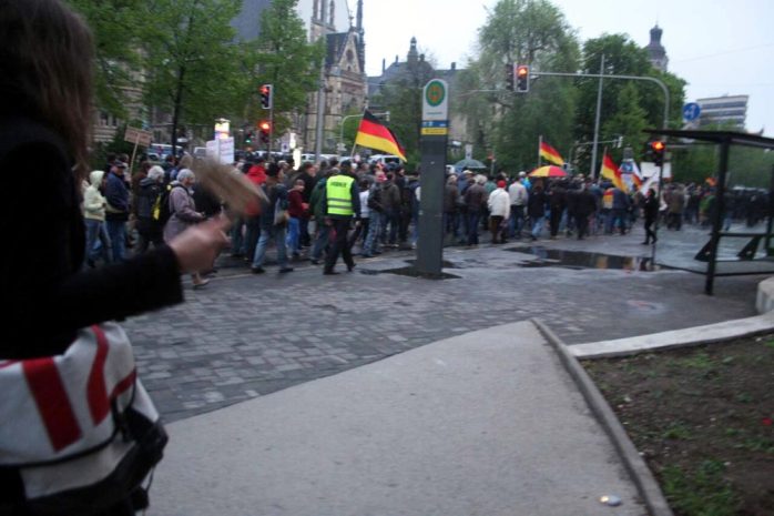 Nach dem “Spaziergang” verspricht Rösler ein “Rednerfeuerwerk” mit dem Neurechten Götz Kubitschek und natürlich Lutz Bachmann. Gegen 19:40 Uhr brechen die Legidateilnehmer zu ihrem Rundgang auf dem Martin-Luther-Ring Richtung Richard-Wagner-Platz auf. Es ertönen wieder die Rufe “Wer Deutschland nicht liebt, soll Deutschland verlassen”. Alexander K. (Die Rechte) befindet sich heute wieder unter den Demonstranten.