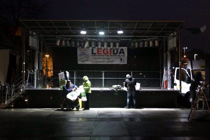 Zum Einstieg kommt das übliche Gedudel. Interessant, dass Legida selbst vor den Demonstrationsauflagen heute die Melodie vom “Schwarzen Kanal” – einer reichlich unverhohlen propagandistischen DDR-Sendung – einspielen. Man wird doch nicht etwa selbstkritisch? Anschließend das Lied “Wir sind das Volk” – die Schunkelhymne von Legida zum Mitsingen, welche davon handelt, wie das Volk hungert, die Medien lügen und die Politiker “feige Gestalten” sind.