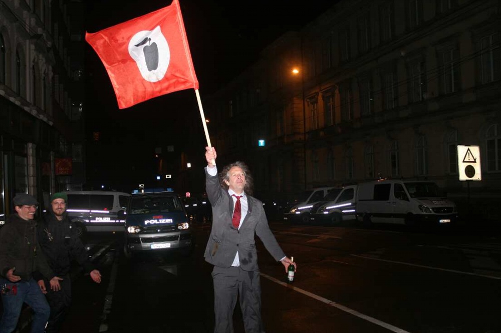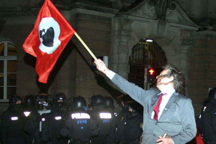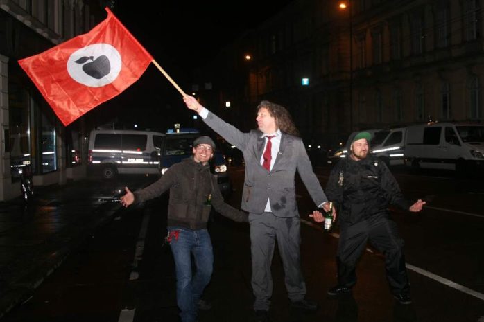 Einfach mal ein paar Impressionen vom heutigen Ende einer montäglichen Beschäftigungstherapie in Leipzig. Während Lutz Bachmann ins Tal der Ahnungslosen zurückkehrt, wird aufgeräumt und ein einsamer Macher von “Legida-Das Original” tanzt gemeinsam mit zwei Freunden auf der Karl-Liebknecht-Straße auf der Höhe der Polizeizentrale Dimitroffstraße mit der Fahne der Apfelfront. Gut, dass Thomas “Kuno” Kumbernuß (Die Partei “Die Partei”) nochmals auf die gestandene Satirefraktion in Leipzig hinweist. Denn ohne Humor, wäre alles nichts. Vielleicht auch eine Art, sich mal bei der ebenfalls anwesenden Polizei zu bedanken – denn heute blieb alles so weit friedlich auch von Seiten der Ordnungshüter.