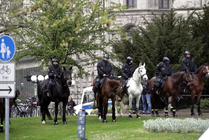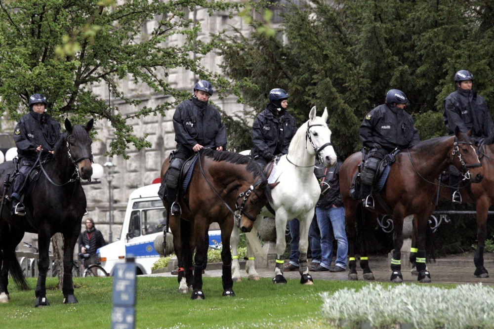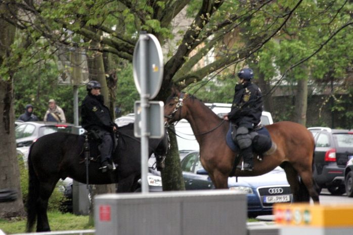 Die Vorbereitungen seitens der Polizei sind offenbar abgeschlossen, man steht bereit. Erneut mit berittener Polizei und diesmal mit einem mobilen Flutlicht. Wenn es hilft, dass heute alle den Überblick bewahren und es friedlich bleibt – warum auch nicht?