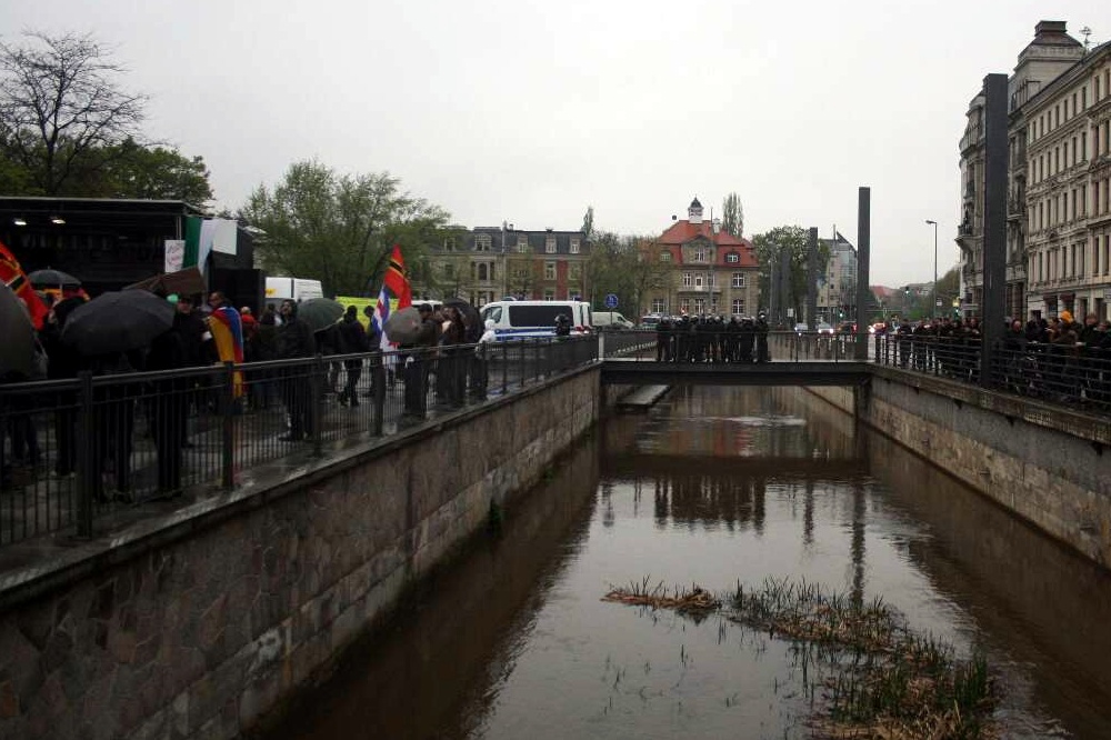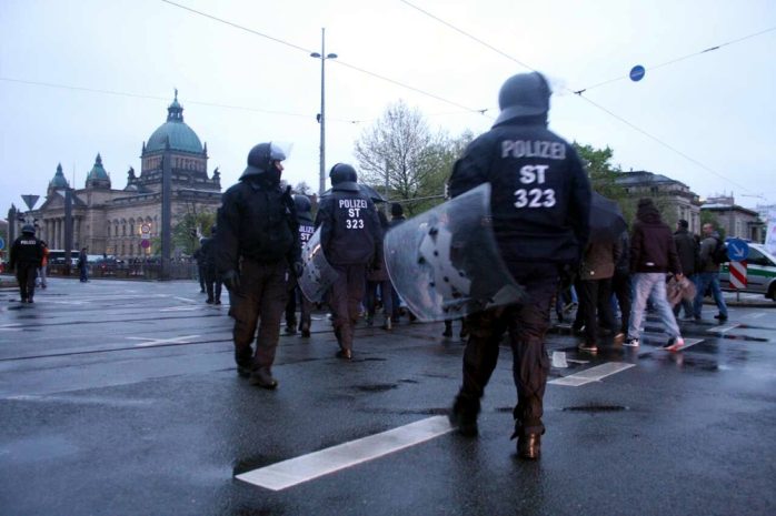 Wie aufs Stichwort kam es heute dennoch in genau der „Hool-Zone“ (NoLegida-Begriff bei der Warnung vorab) in der Großen Fleischergasse fast zu einem Zusammenprall weit ab vom eigentlichen Demonstrationsgeschehen. Doch nach den Vorgängen eine Woche zuvor, welche bislang einseitig von den NoLegida gemeldet worden war, standen diesmal die Beamten parat. „In der großen Fleischergasse kam es zum Aufeinandertreffen von 30 LEGIDA-Sympathisanten, die sich nicht dem Aufzug angeschlossen hatten und LEGIDA-Gegnern. Beide Lager mussten durch die Polizei getrennt werden.“ heißt es seitens der Polizeidirektion Leipzig (PD) nach dem Abschluss der Demonstrationen vom 27. April. Interessant, dass sebst diese Situation ohne Festnahmen oder ähnlichem auskam.