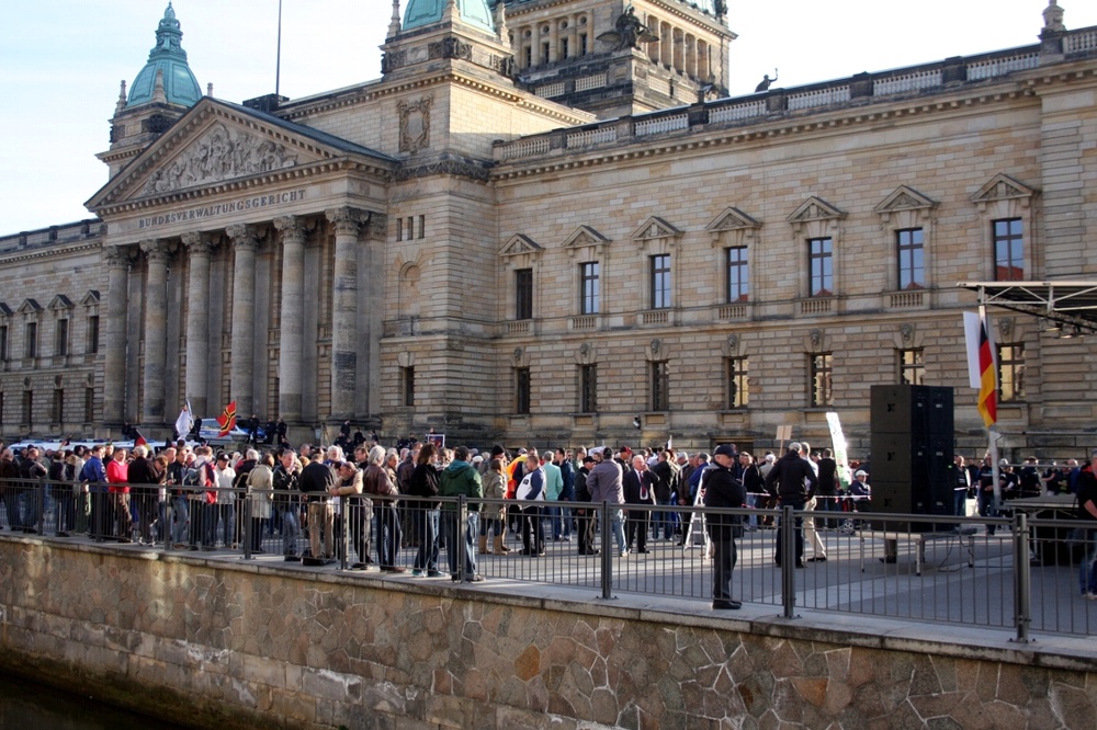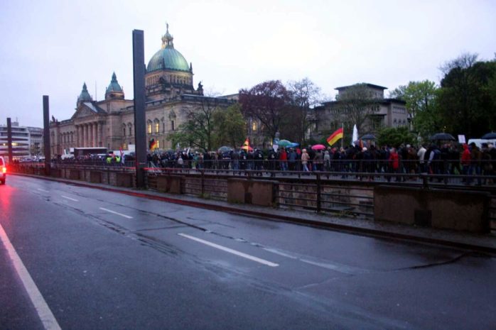 Wie schon am 20. April gestatten wir uns einen Blick mit unseren Lesern gemeinsam auf die Bühne von Legida. Die Veranstalter übertragen die Reden – heute immerhin mit Gründervater Lutz Bachmann von Pegida – live ins Netz. Warum also nicht zuschauen, lauschen und über das Gesprochene nachdenken? Und natürlich das eine oder andere ive kommentieren. Der Stream ist seit 18:58 Uhr online. Zu sehen ist das Bundesverwaltungsgericht auf dem Simsonplatz im leichten Nieselregen.