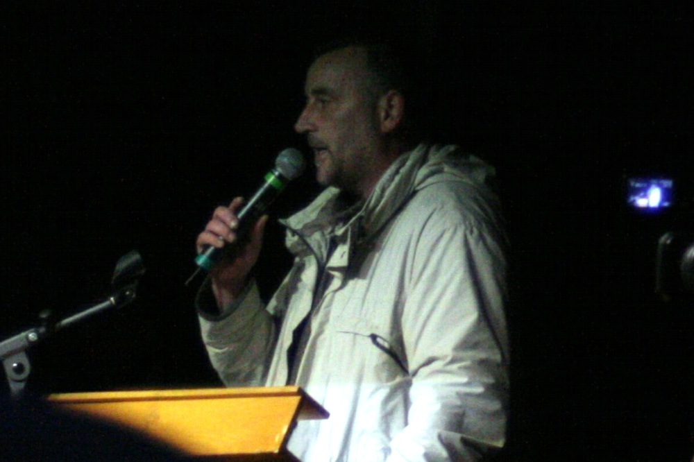 Eigentlich muss Legida heute mit einem ganz anderen Andrang gerechnet haben. Götz Kubitschek dürfte sich von seinen zurückliegenden Ansprachen an andere Mengen gewöhnt haben, heute wird er hier – nach dem Dank von Silvio Rösler an die Polizei – den Anfang vor dem geschrumpften Volk mit seiner Ansprache machen. Götz Kubitschek – bekennender Neurechter und Verleger – macht mit einem Potpourrie mit großen Bildern zu den vergangenen drei Stunden eine emotionale Rundreise durch ein offenbar schreckliches Land namens Deutschland. Was alles in dieser Zeit passiert sei. Flüchtlinge auf dem Weg ins “Land, wo Milch und Honig fließen – Europa”.