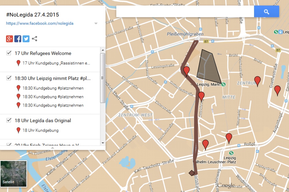 Seit 17 Uhr ist also die Auftaktkundgebung von „Refugees Welcome“ am Wilhelm-Leuschner-Platz Ecke Schillerstraße gestartet. Wer sich nochmals über die vielen Orte der heutigen Demonstrationen neben dem Simsonplatz und der Route von Legida über den westlichen Ring informieren möchte: NoLegida hat für heute eine Übersichtskarte bei Google inklusive des Routenverlaufes und aller weiterer Demonstrationspunkte erstellt.