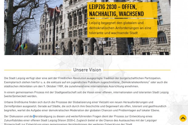 Auf der vom BMBF angelegten Homepage präsentieren die beteiligten Stadtverwaltungen schon einmal ihre Arbeitsziele. Leipzigs Verwaltung hat unter dem Titel “Leipzig 2030 – offen, nachhaltig, wachsend” schon einmal die ersten Thesen zu einer “toleranten und wachsenden Stadt”, die den “globalen und demokratischen Herausforderungen begegnet”, veröffentlicht.