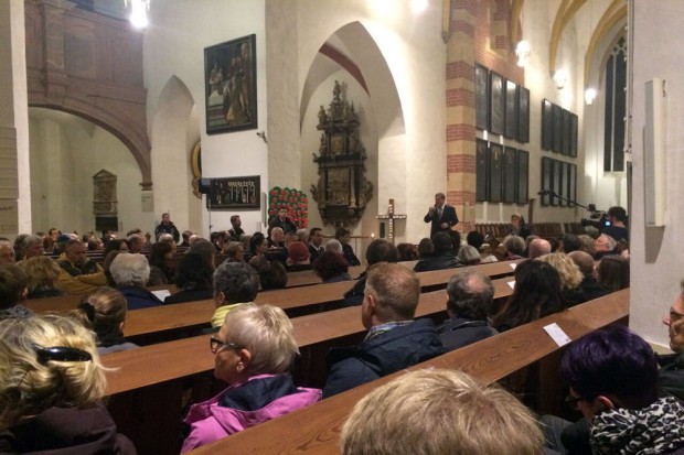 "Ein Ort, wo Menschen zusammenkommen, um aufeinander zu hören, um miteinander nachzudenken und miteinander ins Gespräch zu kommen." Das ist die Thomaskirche. Pfarrerin Britta Taddiken eröffnete mit diesen Worten am gestrigen Dienstagabend die Informationsveranstaltung zur neu geplanten Flüchtlingsunterkunft am Brühl. Auf Einladung des Sozialamtes waren mehrere hundert Interessierte in das Gotteshaus gekommen, um sich mit den Gegebenheiten der neuen Flüchtlingsunterkunft im ehemaligen Interpelz-Gebäude in der Innenstadt vertraut zu machen.