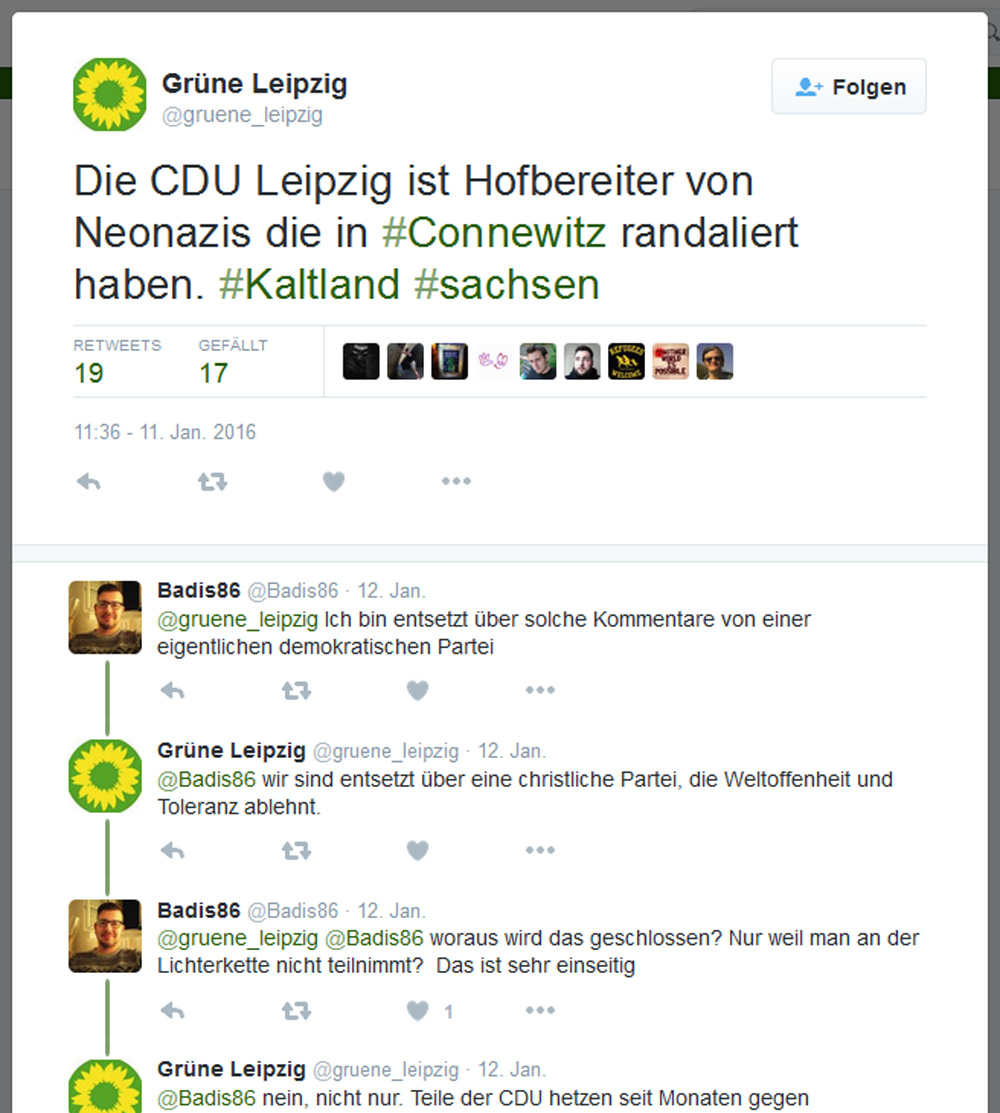 Mit dem Nazi-Vergleich meint man augenscheinlich einen Tweet, der am 11. Januar auf dem Twitter-Account der Grünen veröffentlicht wurde: “Die CDU Leipzig ist Hofbereiter von Neonazis die in #Connewitz randaliert haben. #Kaltland #sachsen”. Der sorgte dann kurzzeitig für eine Diskussion mit einem emsigen CDU-Mann und mündete dann in die Frage, wer sich nun von was zu distanzieren habe. Keine wirklich erhellende politische Diskussion. Aber für den Kreisvorsitzenden der Leipziger CDU, Robert Clemen, Grund genug, sich noch einmal deutlich zu distanzieren: “Wenn unsere politischen Mitbewerber glauben, dass wir auf solche platten Angriffe allein mit theoretischen Aufsätzen antworten, dann täuschen sie sich gewaltig. Die CDU Leipzig wird sich auch in ihrer Rhetorik zu wehren wissen.”