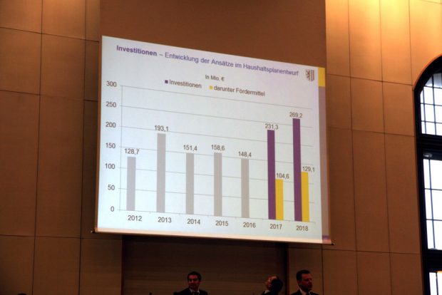 Einem Überschuss in Höhe von knapp 45 Millionen Euro im laufenden Jahr steht ein Defizit von etwa 24 Millionen Euro im Jahr 2018 gegenüber. Insgesamt ist der Haushalt somit im Plus. „Das ist ein sehr guter Haushalt mit finanzierbaren Änderungsanträgen“, lobte Finanzbürgermeister Torsten Bonew (CDU) zu Beginn der Sitzung. „Wir gehen von einer Genehmigungsfähigkeit aus.“