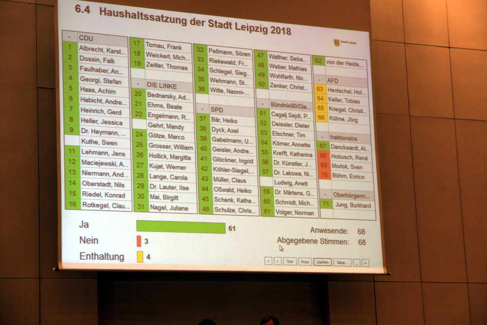 Die FDP, Ex-NPD-Stadtrat Enrico Böhm und Piratin Ute Elisabeth Gabelmann stimmten dagegen, die AfD-Fraktion enthielt sich. Die Abstimmung für den Haushalt des Jahres 2018 brachte ein ähnliches Ergebnis, mit einer Ausnahme: Gabelmann stimmte nun mit „Ja“.