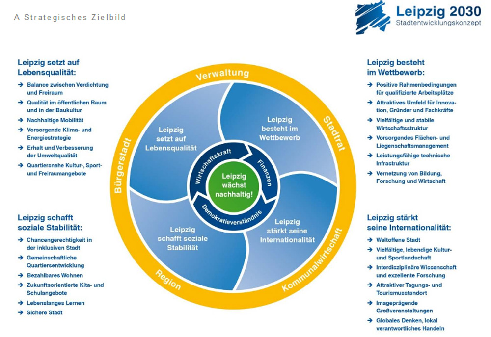 „Leipzig 2030“ (INSEK) heißt das 300-Seiten-Papier. INSEK steht für integriertes Stadtentwicklungskonzept. Und integriert heißt: Die einzelnen Planungsfelder werden nicht alle für sich bearbeitet – Bauen, Wirtschaft, Bildung, Verkehr, Integration usw. Schon als 2009 das jetzt gültige Stadtentwicklungskonzept (Seko) vom Stadtrat beschlossen wurde, steckte ein Stück integriertes Denken drin. Das hatten Stadtrat und Verwaltung in der depressiven Phase zwischen 1998 und 2005 gelernt, als Leipzig weltweit als das Mustermodell einer „shrinking city“ gehandelt wurde und Delegationen aus vielen europäischen Großstädten an die Pleiße reisten, um sich anzuschauen, wie eine schrumpfende Stadt aussieht – und wie sie das Beste daraus macht.