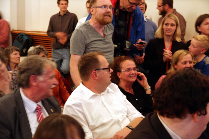 Im Norden Leipzigs gibt es Stadtteile, wo die AfD die CDU überrundet, gleichzeitig könnte Sören Pellmann (Die Linke) tatsächlich Thomas Feist (CDU) im Kampf um die Erststimmen schlagen. Bei jedem neuen Chart nach weiteren ausgezählten Vierteln erschallt Jubel aus der Linken-Gruppe, welche sich um Sören Pellmann im Nebensaal des Ratssaals gesammelt hat.