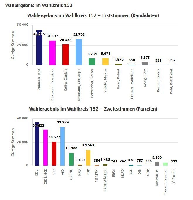 Und während Jens Lehmann (CDU) gegen 20:30 Uhr im Norden das Direktmandat praktisch schon sicher hat, schafft es Sören Pellmann (Linke) im Süden möglicherweise, Thomas Feist (CDU) das Direktmandat abzujagen. Es bleibt ein Kopf-an-Kopf-Rennen.