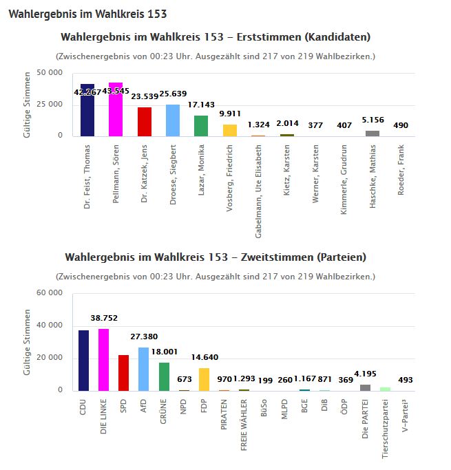 +++ 23:54 Uhr +++ 424 von 430 Wahlbezirken gesamt sind ausgezählt und nur im Wahlkreis 153 blieb es lange wirklich spannend. Doch auch hier sind nun 214 von 219 Kreisen gezählt und Sören Pellmann (Linke) kann offenbar den hauchdünnen Vorsprung vor Thomas Feist (CDU) doch halten. 1.481 Stimmen bei 43.070 gesamt trennen ihn seit 23:18 Uhr von Feist (41.589). Update 0:08 Uhr: Weiterhin führt Pellmann mit über 1.000 Stimmen und es sind nur noch zwei Wahlkreise offen.
