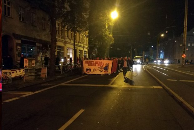 Kurz nach 21:30 Uhr trafen die Connewitzer vor dem Neuen Rathaus ein. Seither erschallt es „Ob Ost, ob West, nieder mit der Nazi-Pest“ und „Nationalismus raus aus den Köpfen“. Die linke Szene in Leipzig ist reichlich konsterniert aufgrund der über 20 Prozent der AfD auch in Leipzig.