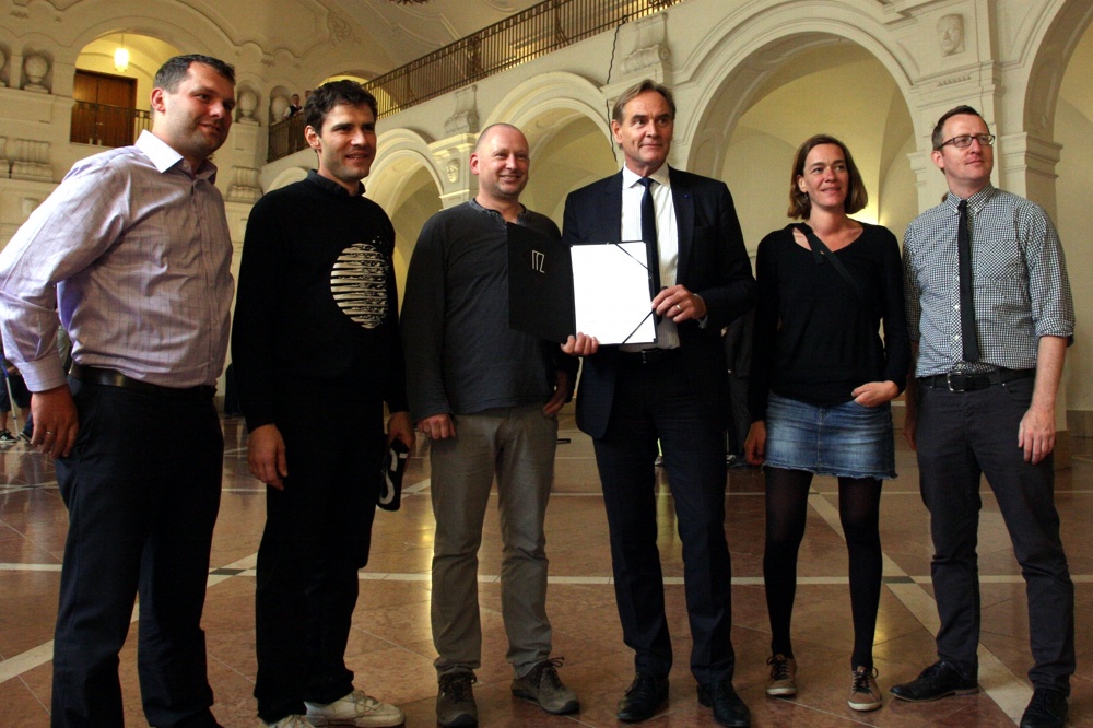 Herrenrunde mit Dame gegen die Sperrstunde. Links von OBM Jung, Christoph Zenker (SPD), Alexander Loth (IfZ), Steffen Kache (Distillery). Rechts vom OBM Juliane Nagel (Linke) und Norman Volger (Grüne). Foto: L-IZ.de