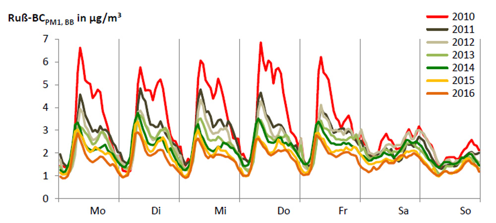 Dass Ruß und Stickoxide in der Luft großenteils direkt aus dem Verkehr stammen, zeigen die von LfULG und TROPOS schon 2010 gemessenen Belastungskurven eindeutig. Mit dem beginnenden Berufsverkehr am Montagmorgen schnellt die Belastungskurve in beiden Fällen hoch, sinkt am Abend wieder ab, um am nächsten Werktag wieder anzusteigen. Nur mit einem Unterschied: Ab 2011 machte sich die Wirkung der Umweltzone bei den Rußpartikeln schon bemerkbar, die Kurven fielen deutlich niedriger aus und sie sanken in den Folgejahren immer weiter ab.