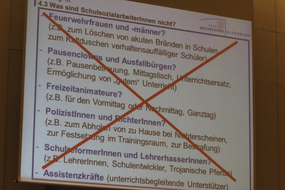 Nach einer kurzen Einführung des Schulbürgermeisters Thomas Fabian (SPD) folgte ein Vortrag des Pädagogen Karsten Speck von der Universität Oldenburg. Er betonte, dass Schulsozialarbeit nur funktionieren könne, wenn Sozialpädagogen und Lehrer miteinander arbeiten und ausreichend Zeit bekämen – mehr als ein oder zwei Jahre. Es gehe sowohl um „soziale Problemlagen“ als auch um die schulische Entwicklung. In Berlin hätte sich gezeigt, dass Schüler häufiger zur Schule kämen, wenn Sozialarbeiter vorhanden sind.
