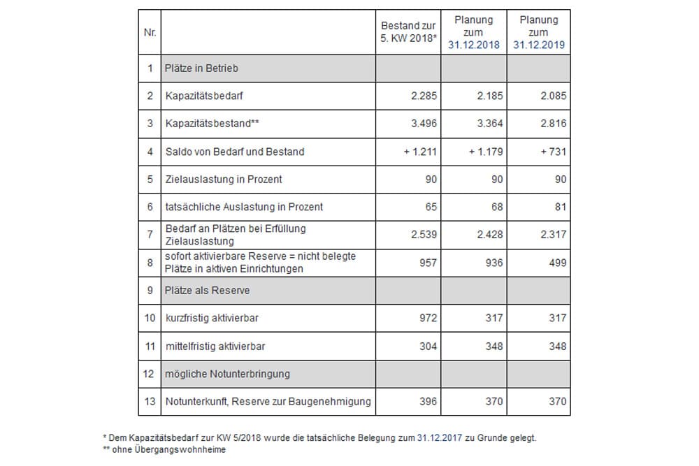 Der Bestand an verfügbaren Unterbringungsplätzen für Flüchtlinge reduziert sich also noch in diesem Jahr von 3.496 auf 3.364Plätze und 2019 dann auf 2.816. Und da ist dann immer noch ein gehöriger Puffer an freien Plätzen, denn das Sozialdezernat rechnet 2018 mit einem Abschmelzen der Unterzubringenden von 2.285 auf 2.185 und 2019 dann auf 2.085.